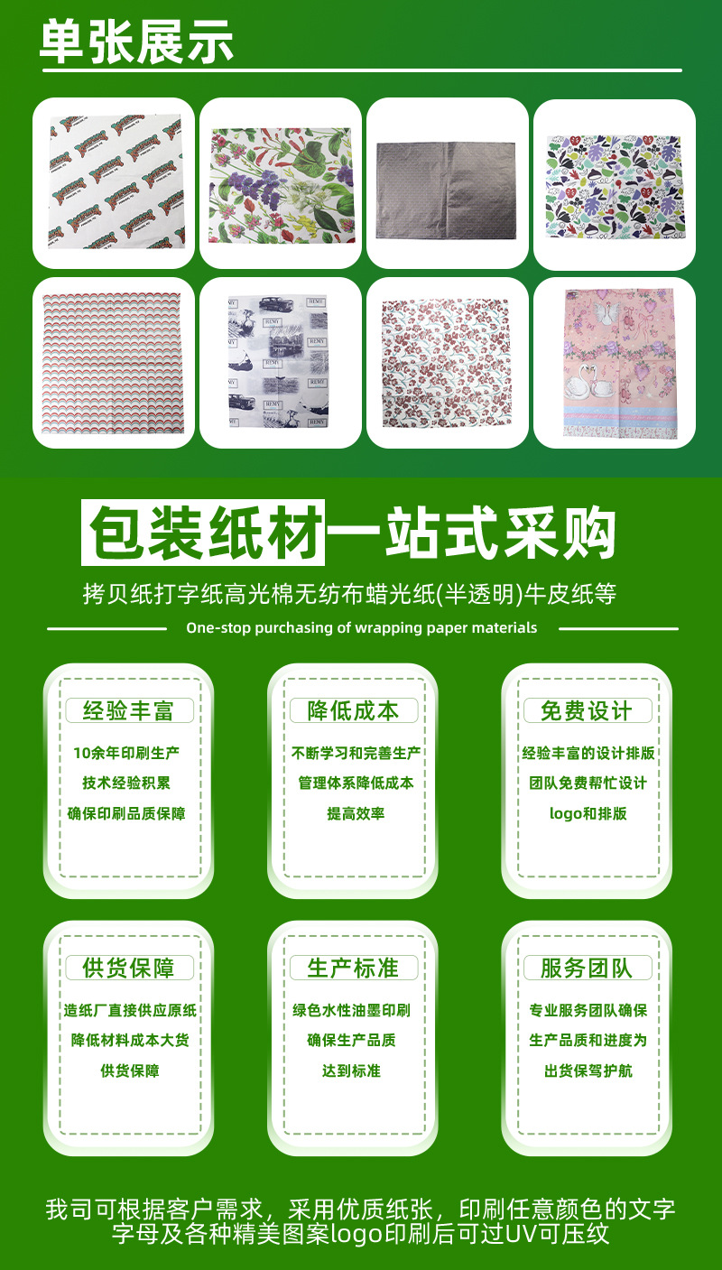 定制印刷logo:17克拷贝纸(雪梨纸)、30克哑面牛皮纸、31克蜡光纸、35-45-60-80克白牛皮纸、75-185克硫酸纸、80-120克双胶纸、105-157克双铜纸----等;