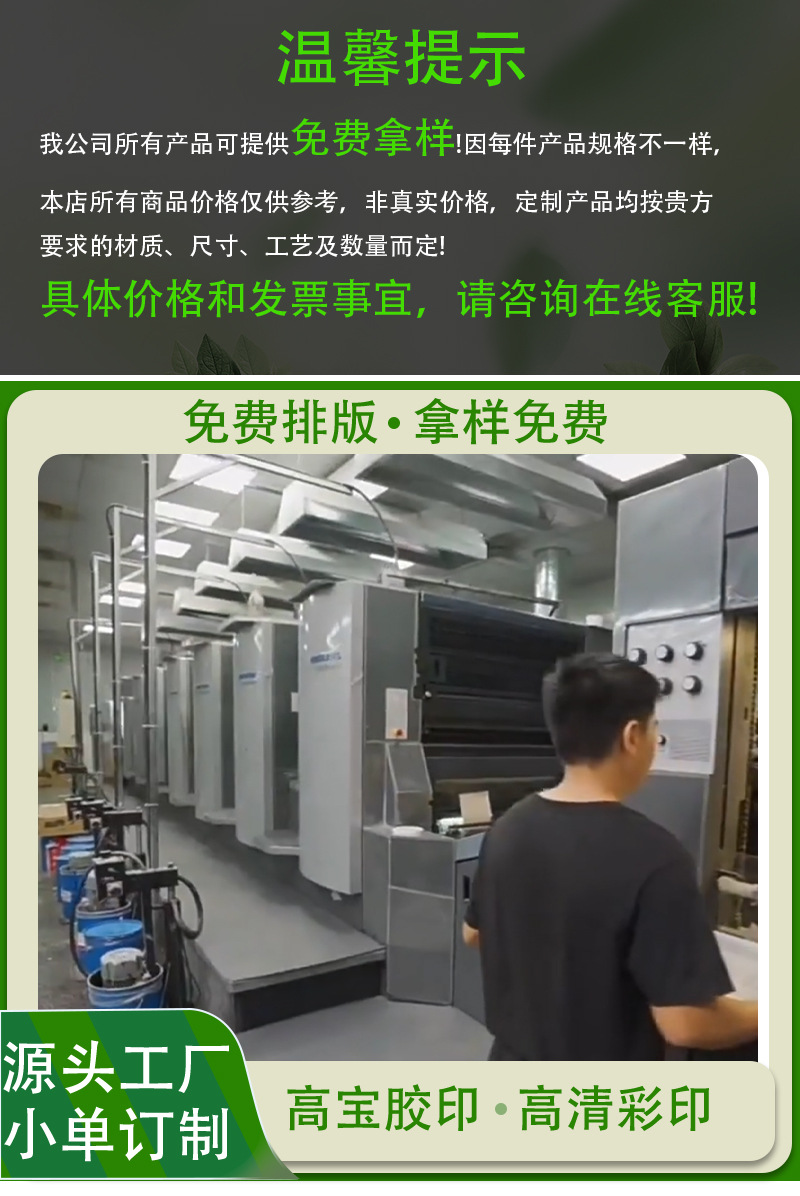印刷前如果对纸张不熟悉,对印刷效果不了解,我们可以提供不同纸质样品,不同图案颜色印刷纸样。请直接拍样品,并联系客服。