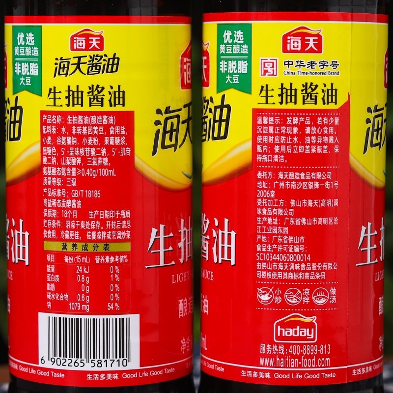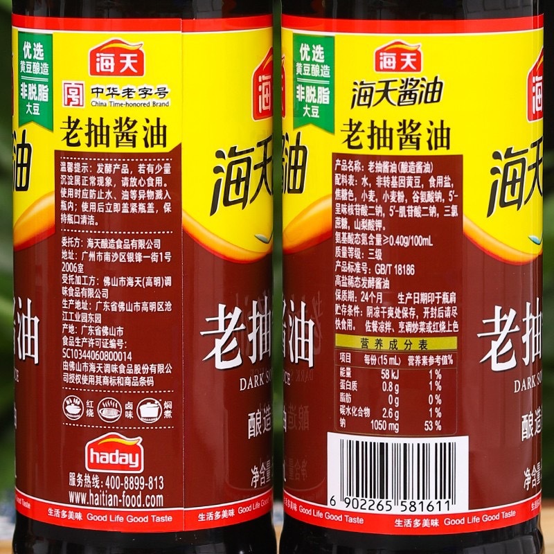 ![]() | Haitian old soy sauce 500ml (one piece/12 bottles, minimum batch of 5 pieces) | ¥4.3 / ≈ 52 ₽ | 198594 | 5718326959357 | |