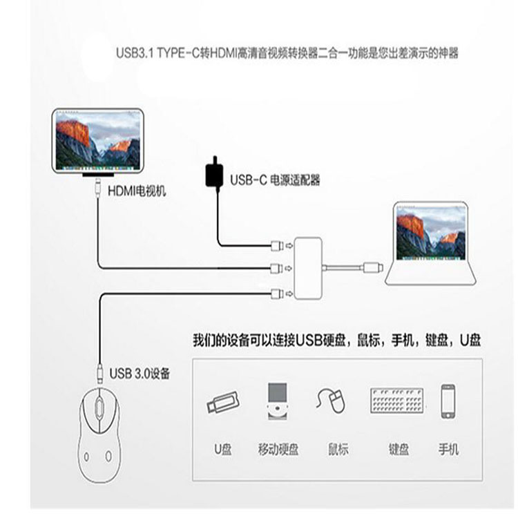 USB 3.1 Type-C转HDMI / USB 3.0 / USB-C多端口适配器