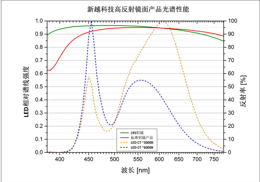 “L95”是专为在COB-LED应用的高温和环境条件下稳定运行而设计的一款产品。与日光优化镜面产品相比,新越科技在金属带材上应用的选择性镀膜技术可将LED光谱范围的光效提高4%。