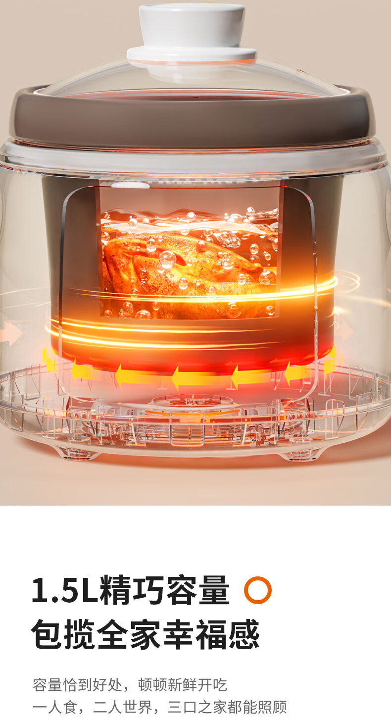 购前须知:该款产品为小功率电炖锅,只能将水加热至有很多小泡冒出的程度。这时水温是达到可以炖熟食物的标准的。无法将水煮至翻滚沸腾。介意请勿下单。