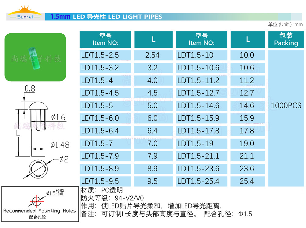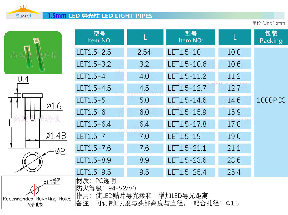 1.5mm导光柱,开孔1.5mm,材质PC