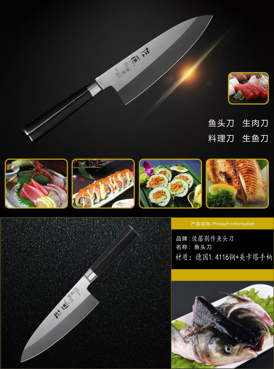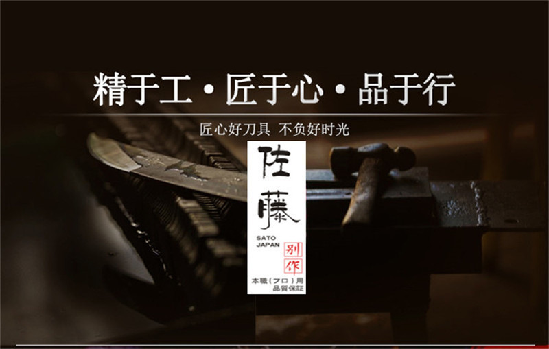 SATO(佐藤别作)是一个由佐田刀具制造的餐具品牌。他们的刀由两种金属制成(钼/钒不锈钢),优良锻造工艺和设计使得 佐藤 成为目前广受欧美和日本厨师喜爱的刀具。佐藤 产品线设计师在世界上制造和销售的一体式结构(集成手柄和刀片)的不锈钢刀。这一设计概念受到了追捧,好的稳定性和美观度,以及专业的打磨技术,引发了刀具界的关注。一体式结构的刀具从此热售。目前拥有丰富的产品线,本店挑选了适合中国家庭使用的厨刀推荐给您。