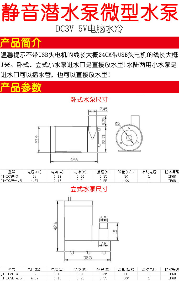 Бесшумный погружной насос, мини-водяной насос DC 3V 5V, охлаждение компьютера, может заряжаться от зарядного устройства или USB