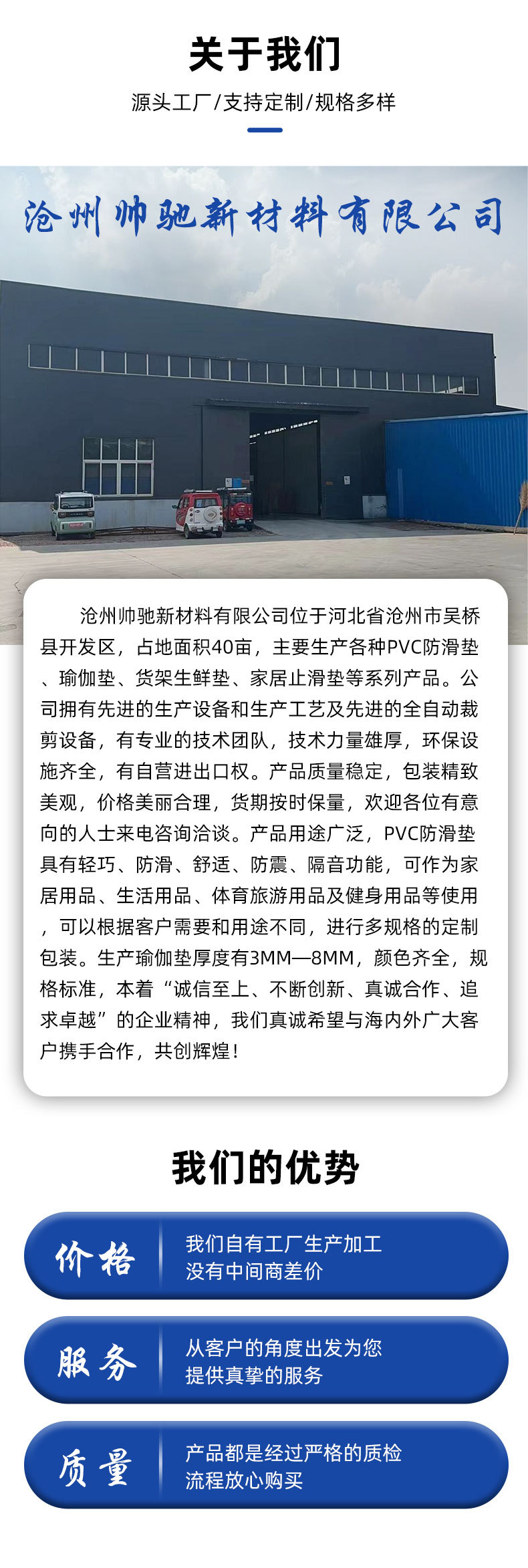 PVC防滑垫是一种防滑性强、弹力高、透气性的发泡垫。产品主要应用于中高档地毯托垫、浴室防滑垫、装饰桌垫、沙发靠垫、贵重物品保护垫等场合。