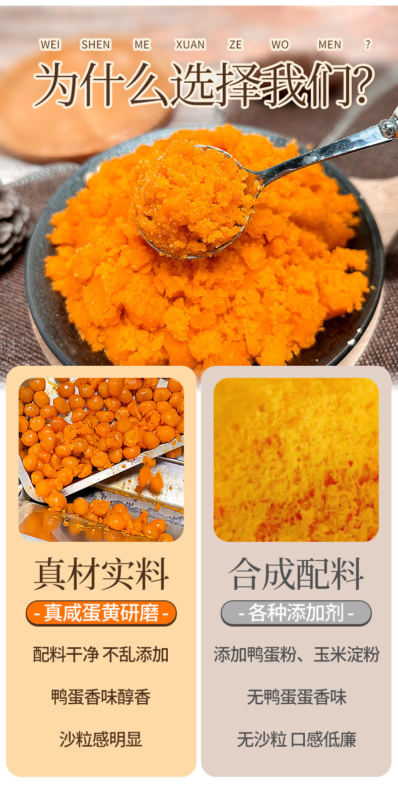 我们这款蛋黄沙是纯咸蛋黄制作,无任何添加,量大价格更加优惠,有需要请联系我们的在线客服。