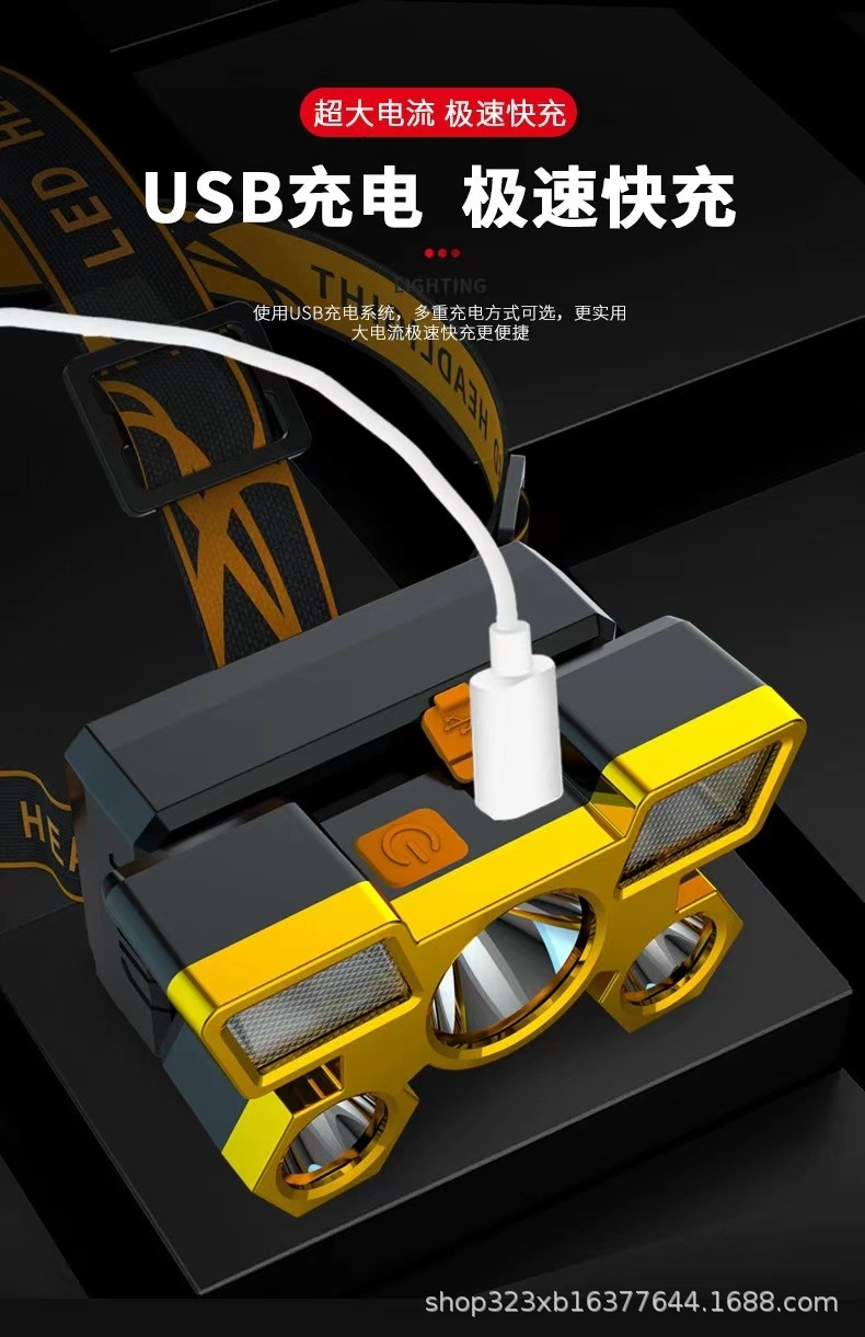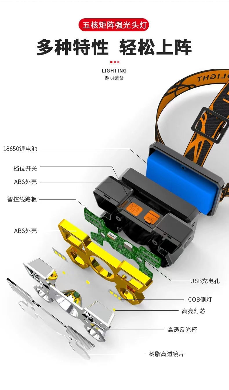 Кросс-бордерный новый яркий налобный фонарь, светодиодный, пятиглавый, USB перезаряжаемый, небольшой фонарик для улицы, фонарь шахтера
