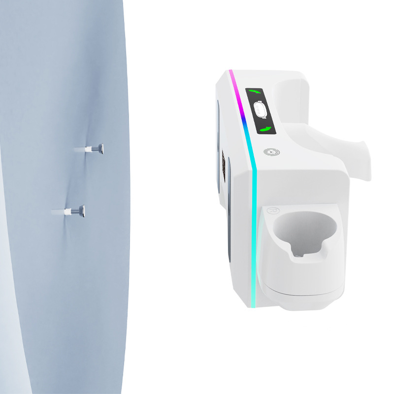 ②可悬挂于墙上(左右两边控制器充电凹槽向上旋转90°,墙上螺丝对准底座背面的墙钉固定孔位,挂上即可);