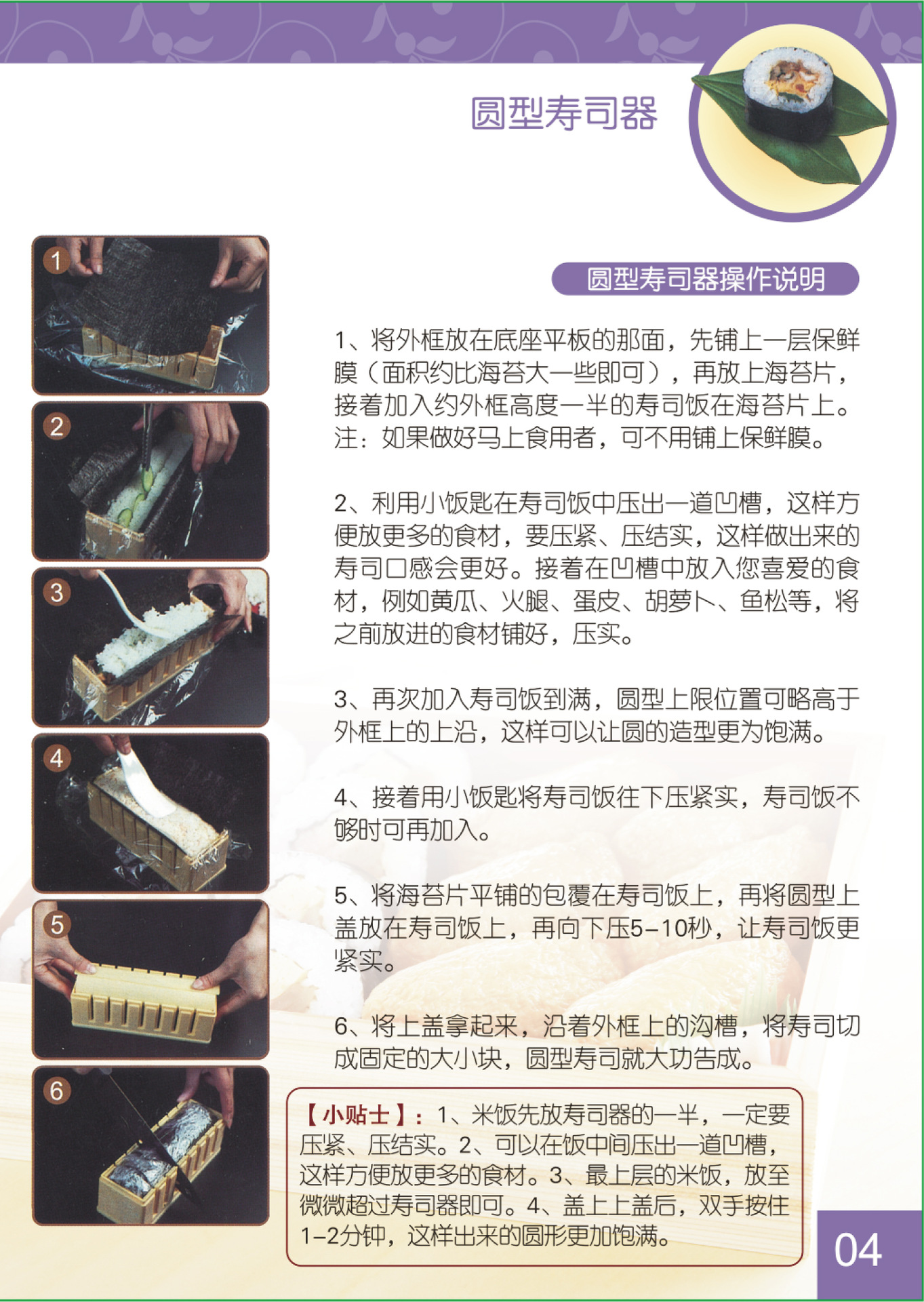 产品为新开发的中号寿司模具,圆形做出来的寿司尺寸为直径4CM,比老款的小了1CM多,尺寸更合理,吃起来方便多了!可以激光加LOGO,具体费用联系我们!