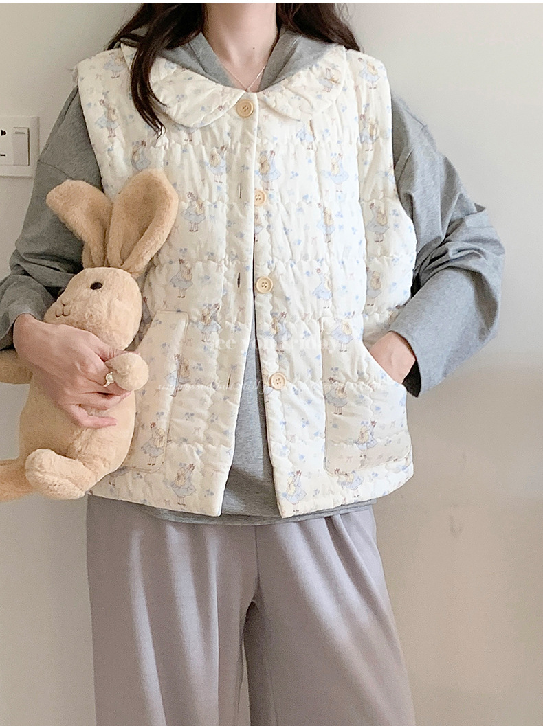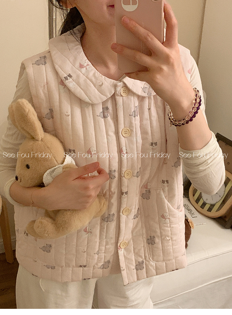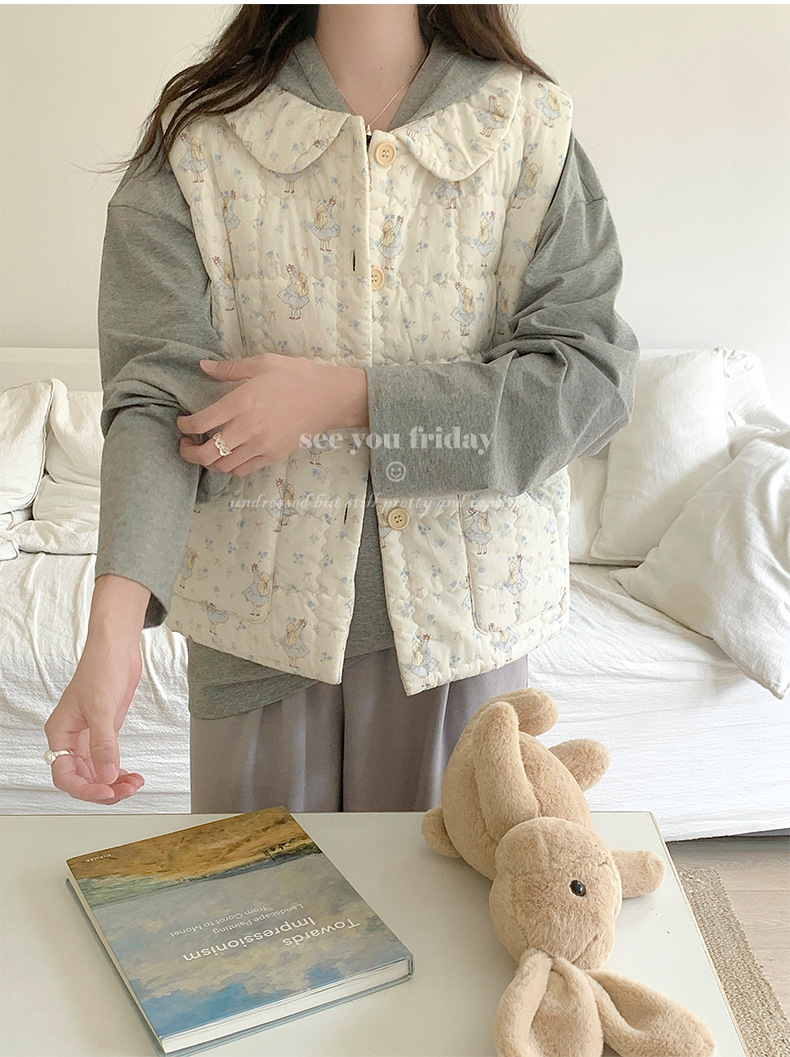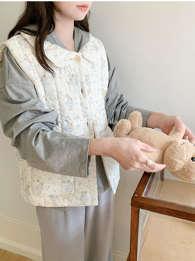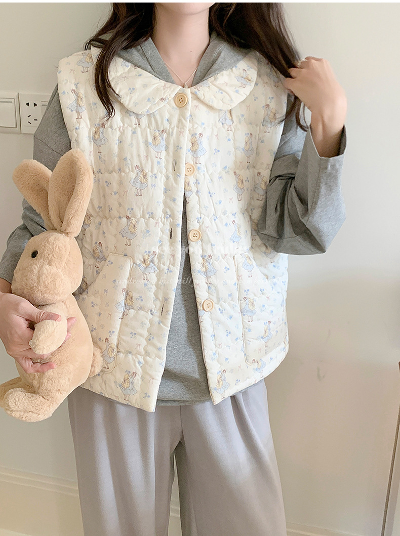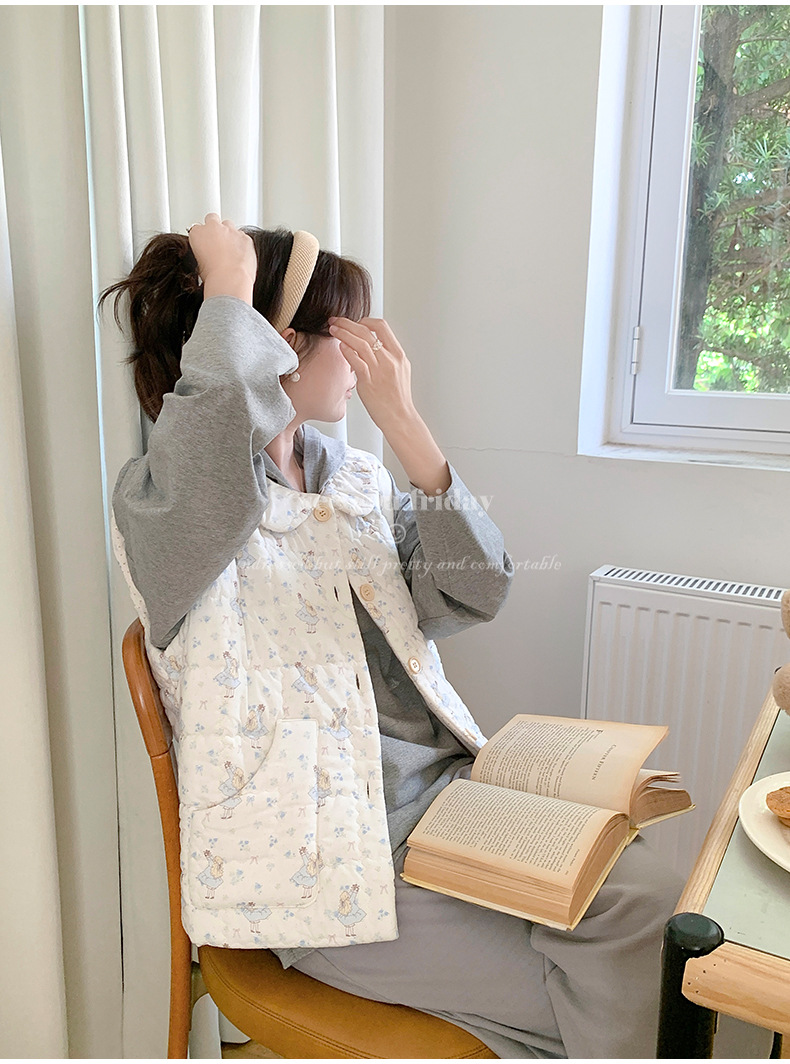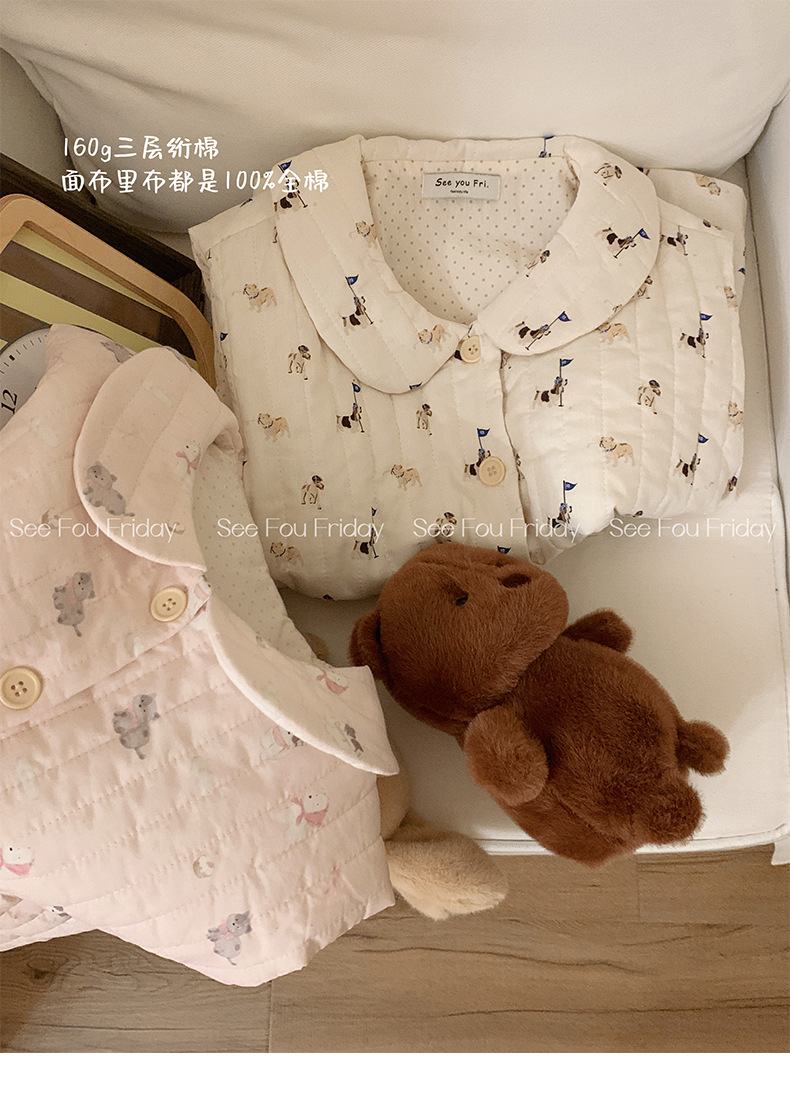 Трехслойные стеганые хлопковые двухцветные мультяшные пижамы с воротником-куколка осень и зима женская 2024 новая одежда