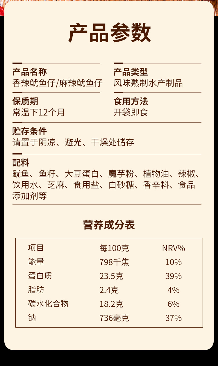 Сырьё и ингредиенты Squid, fish seed, soy protein, konjac powder, vegetable oil, etc