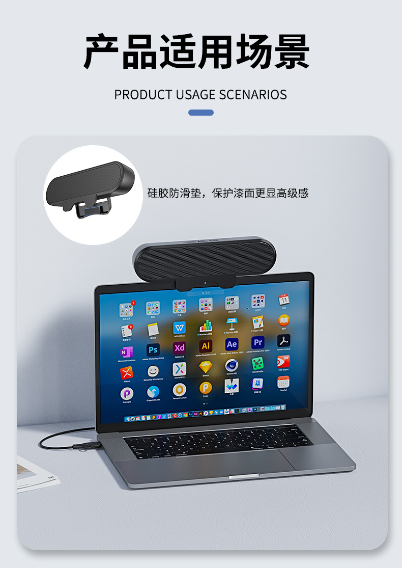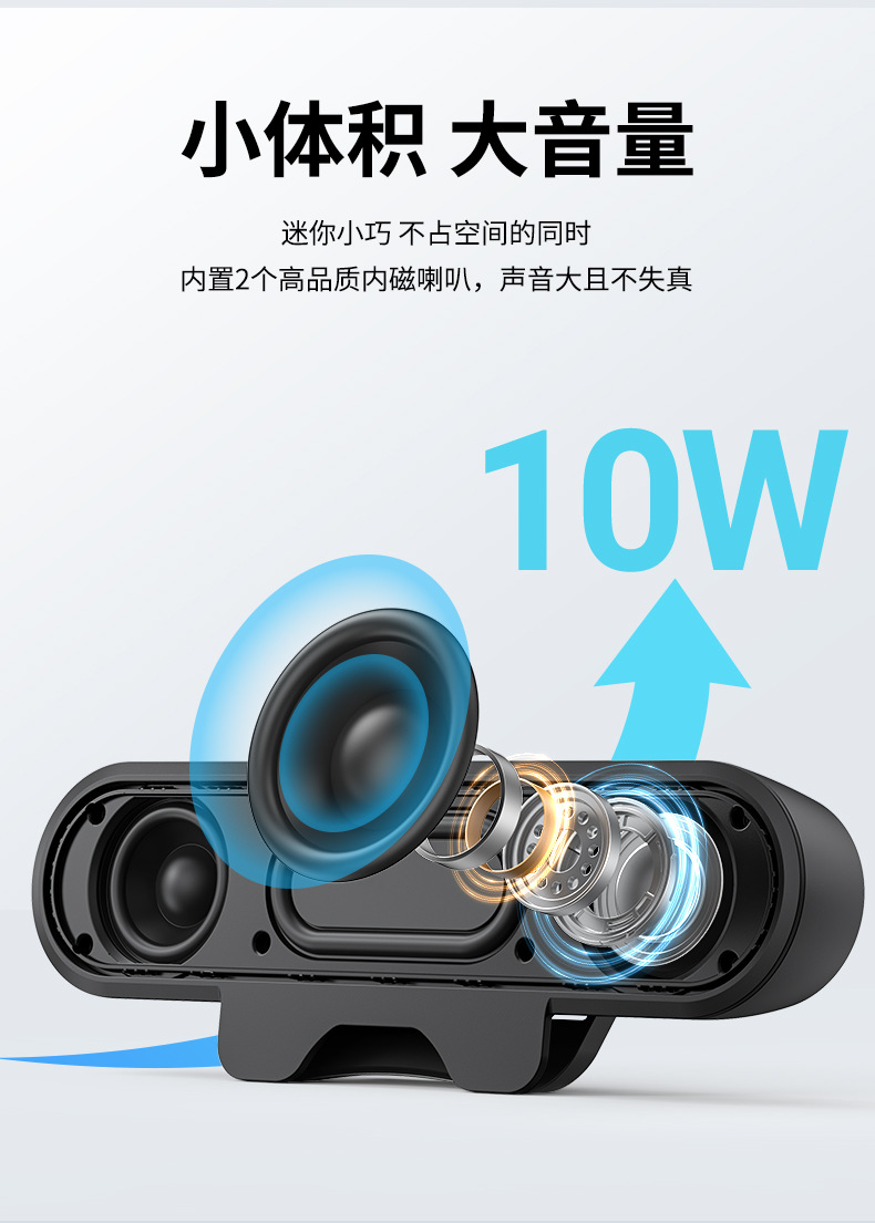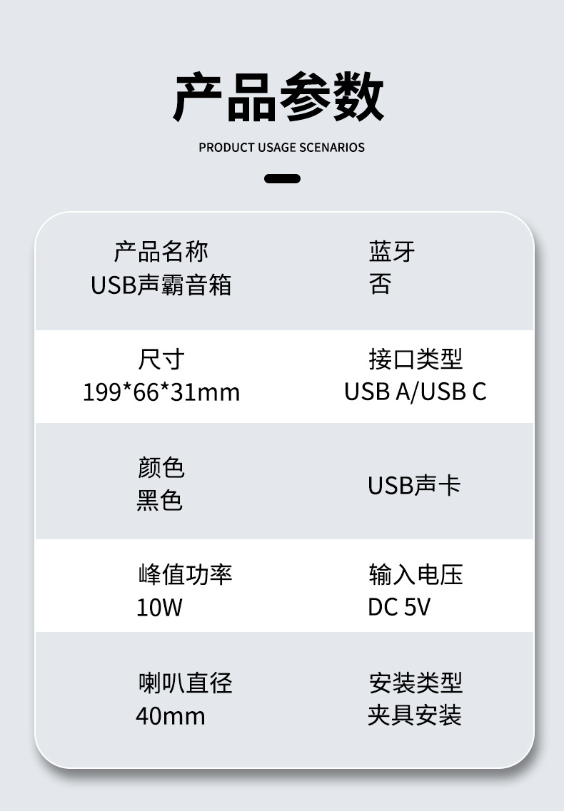 功能:USB夹式声霸音箱 双10W喇叭,立体声重低音 USB/A USB/C)