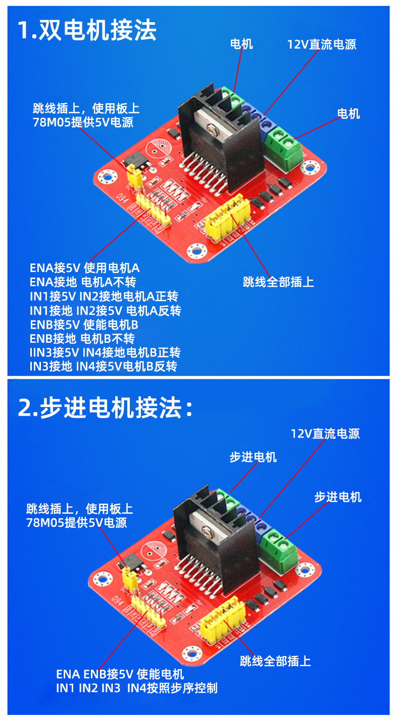 本L298N驱动模块,采用L298N芯片,可以直接驱动两路3-30V直流电机,并提供了5V输出接口,可以给5V单片机电路系统供电,支持3.3VMCU控制,可以方便的控制直流电机速度和方向,也可以控制2相步进电机,是智能小车。