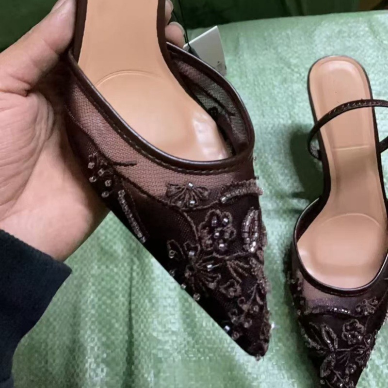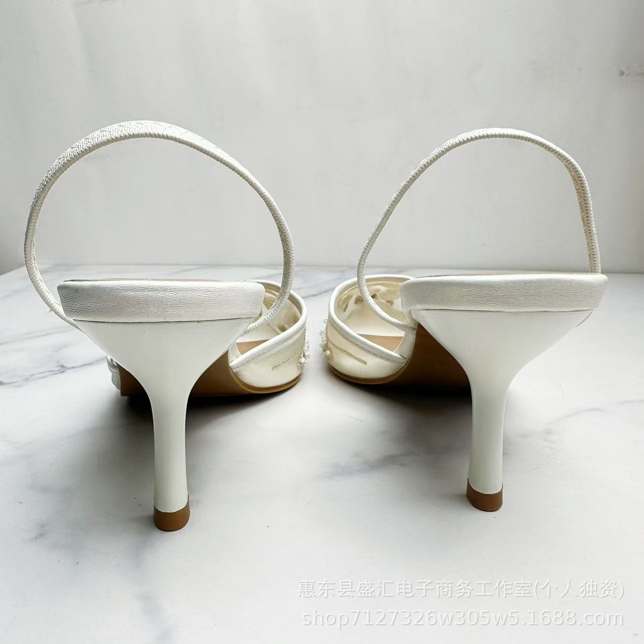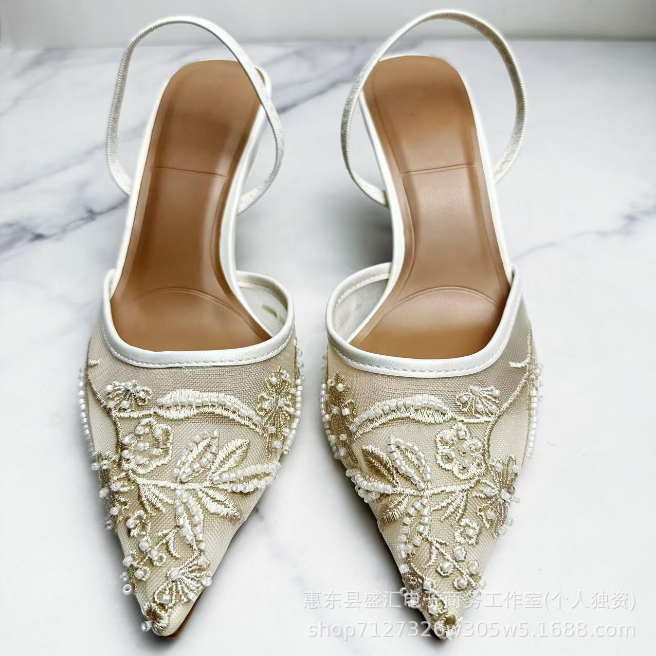 Испания ZA2024 Осень Новые Мюли Белые Вышитые Сетчатые Сандалии На Тонком Каблуке С Задним Ремешком