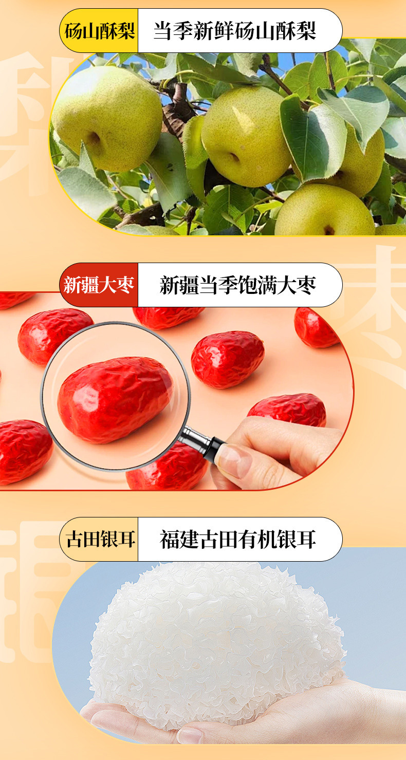 Сырьё и ингредиенты Dangshan crisp pear, drinking water, yellow rock sugar, white fungus, red dates, wolfberry