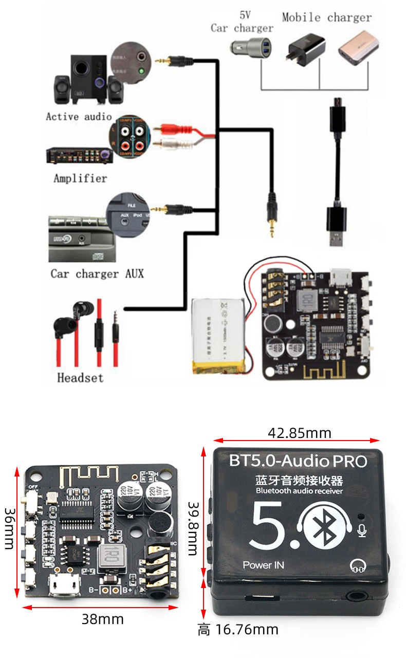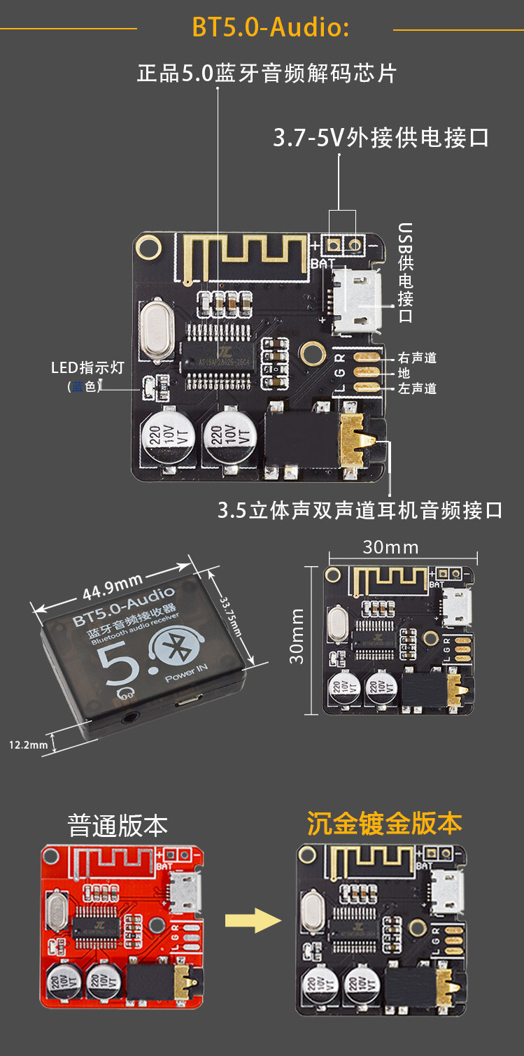 支持蓝牙5.0向下兼容4.1,支持自动回连功能,支持WAV+APE+FLAC+MP3无损解码,立体声输出。