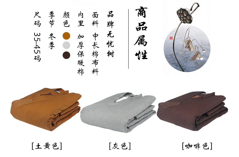 本款内置保暖棉僧服短套,如需要内置毛绒内胆,请联系客服!