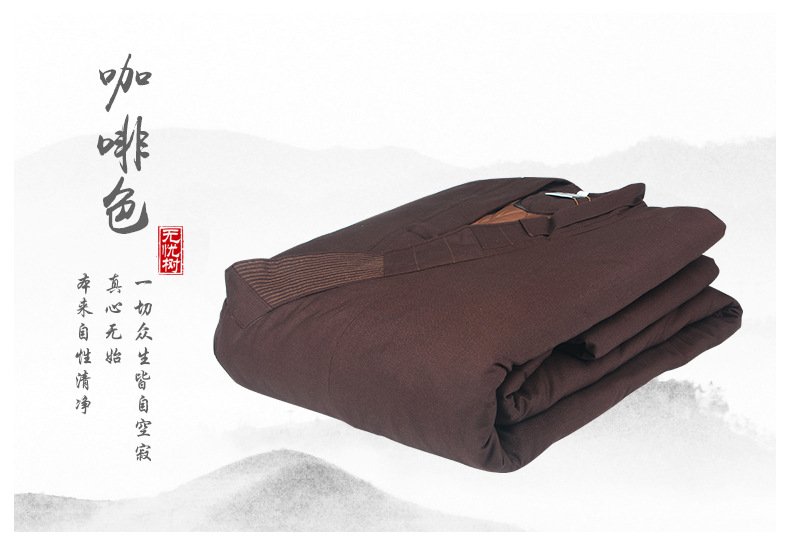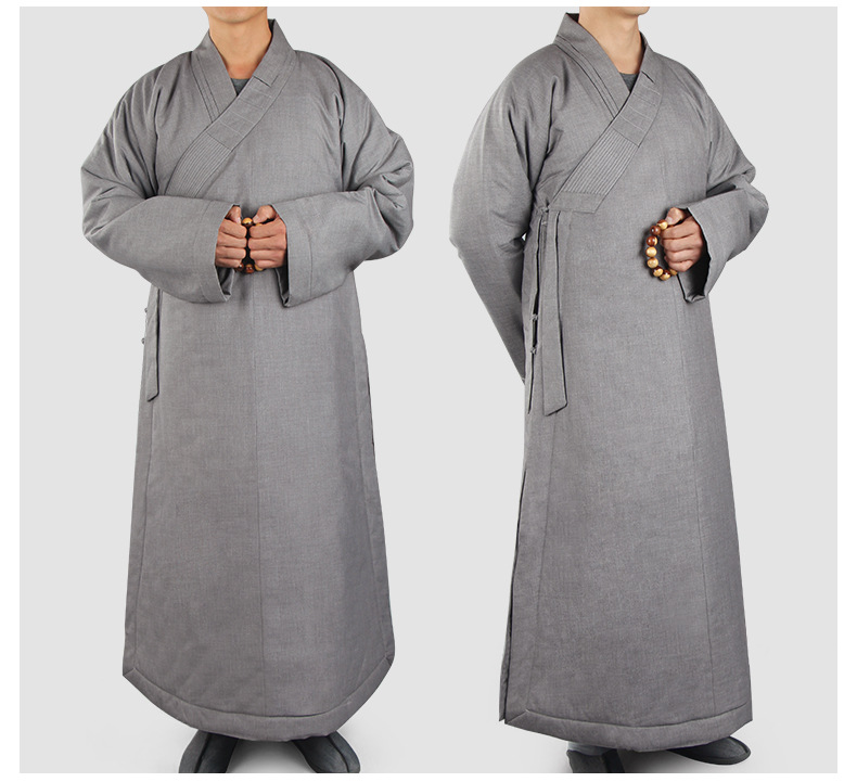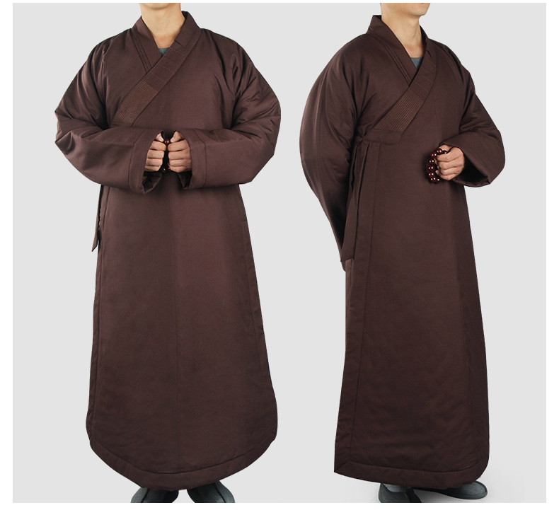 冬季保暖长褂棉袄,为适应季节气温变化,特将布料加厚,内置保暖棉里子,使其保暖性更好,外层选用中长棉面料,有良好的透气性,不会觉得闷热。使用加棉内胆,更厚实,适合师父外出,法会穿着。