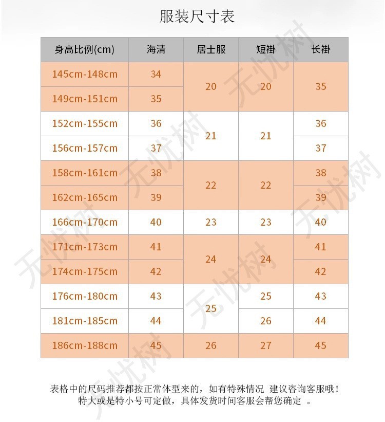 如您不能确定该拍下多大码数,请您直接留言身高,体重,我们会按您的身高体重发货的。【加大胸围联系客服】
