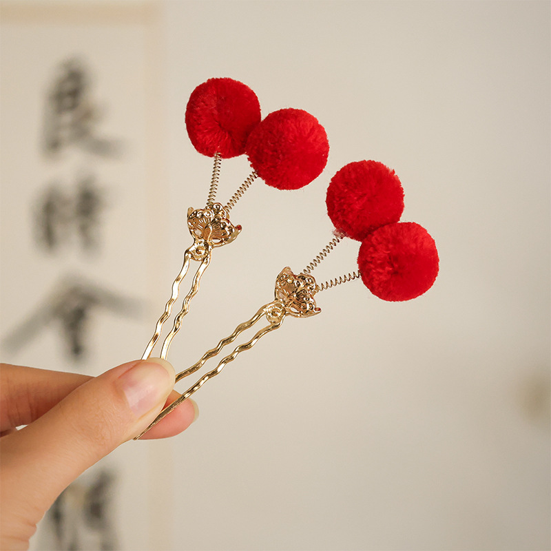 Ханьфу, корона из кроличьего меха, антикварные аксессуары для волос, заколка с шариком, красный кисточка, пара заколок, национальный стиль, новогодний костюм