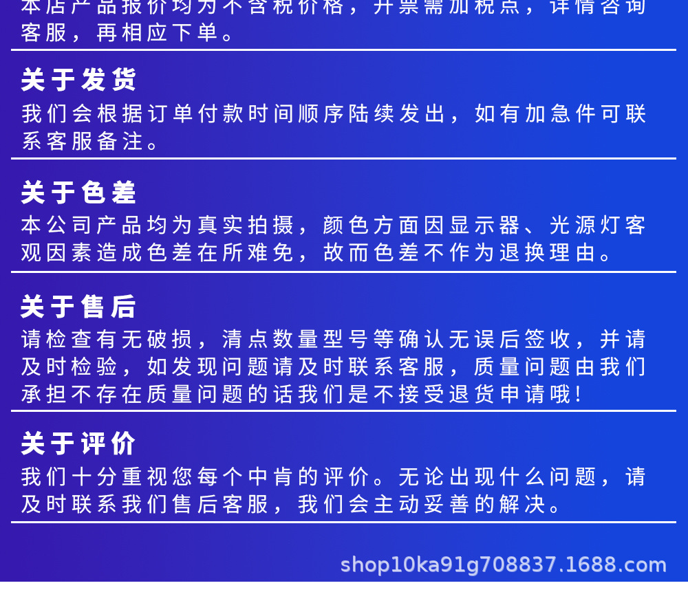 本工厂非专业贸易,客服身兼数职可能无法及时回复,可以一次性把图片/数量/颜色/尺寸以及您的问题都发给客服,这样就可以一次性回答您的问题。