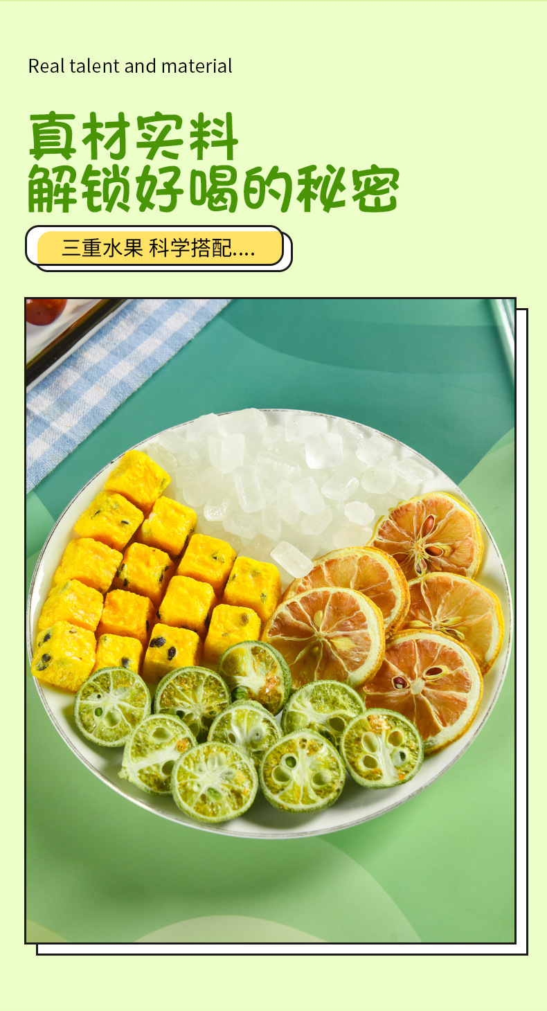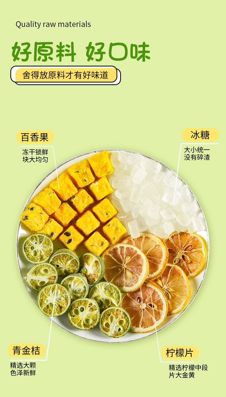 Сырьё и ингредиенты Dried green oranges, lemon slices, passion fruit, rock sugar