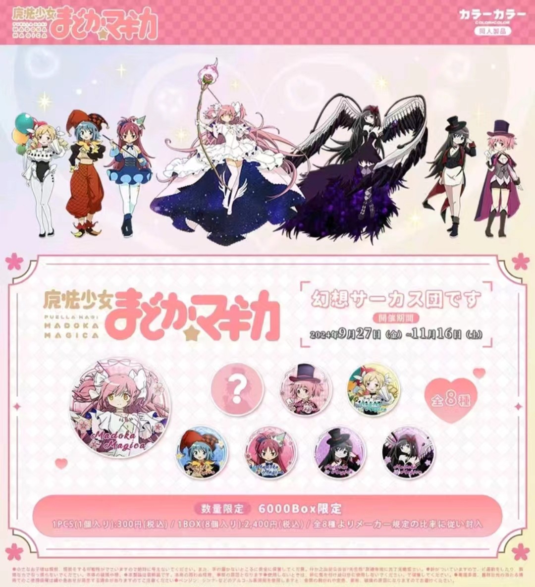 ![]() | (japanese fan-made second creation) puella magi madoka magica badge 2nd edition (8 packs/box) | One unit contains 20 boxes, with each box containing 8 packs. there's a chance of pulling a rare, oversized secret chase figure (58mm) | 8шт: ¥8.00, 16шт: ¥7.50, 160шт: ¥7.30 | 3596 | 5960600988444 | |