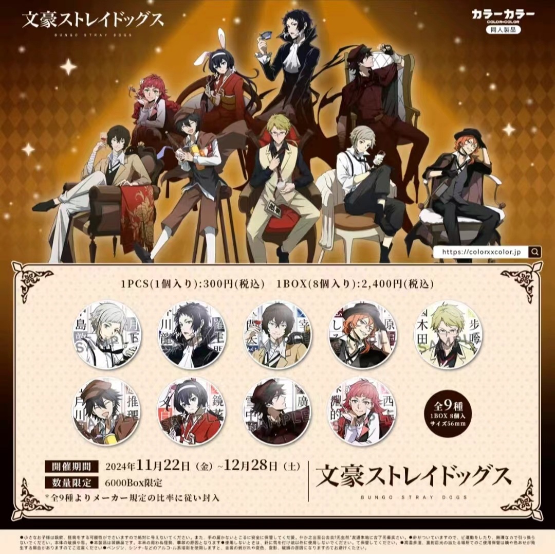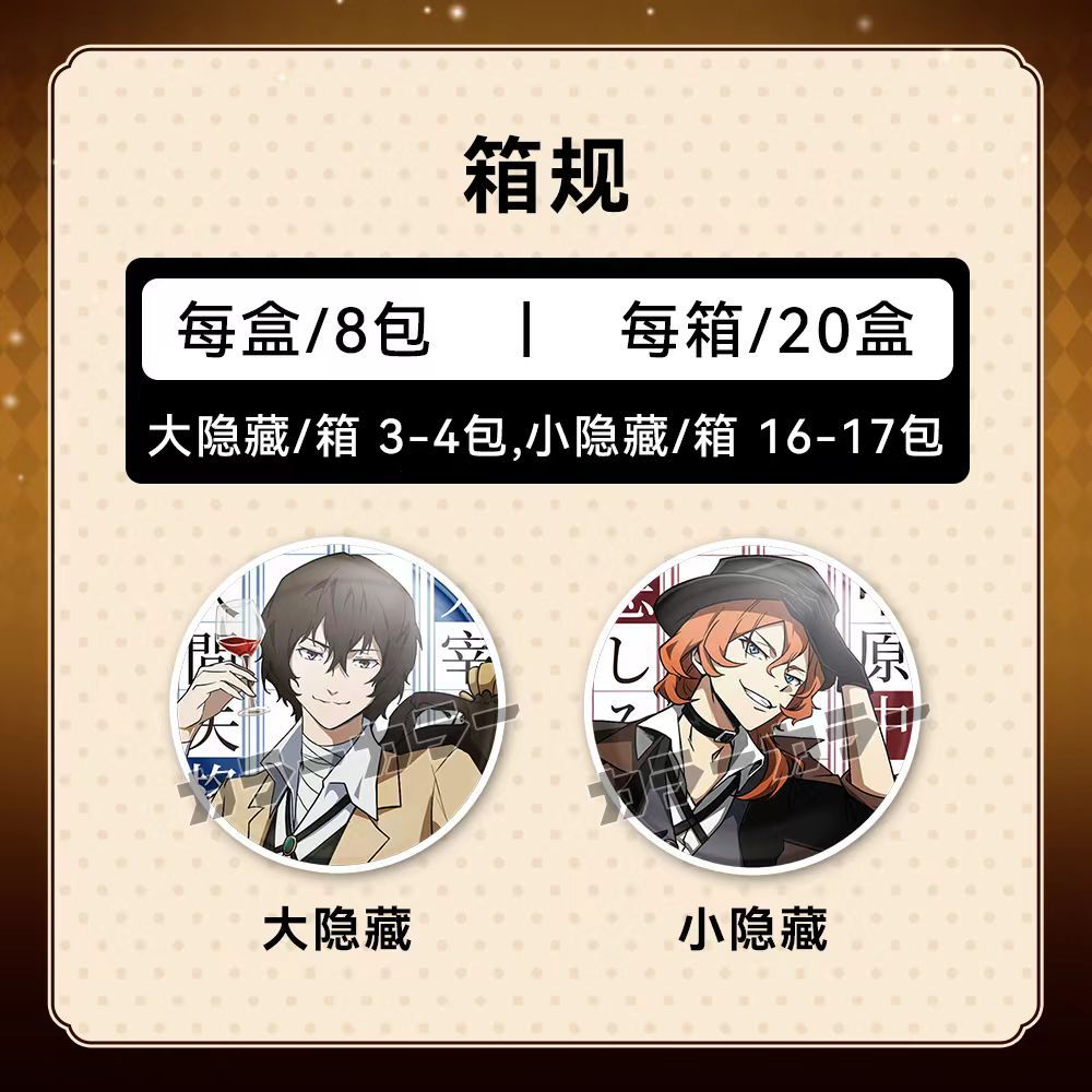 ![]() | (japanese fan erchuang) bungou stray dog badge chapter 2 (8 packs/box) | One unit contains 20 boxes, with each box containing 8 packs. there's a chance of pulling a rare, oversized secret chase figure (58mm) | 8шт: ¥8.00, 16шт: ¥7.50, 160шт: ¥7.30 | 3440 | 5960600988416 | |