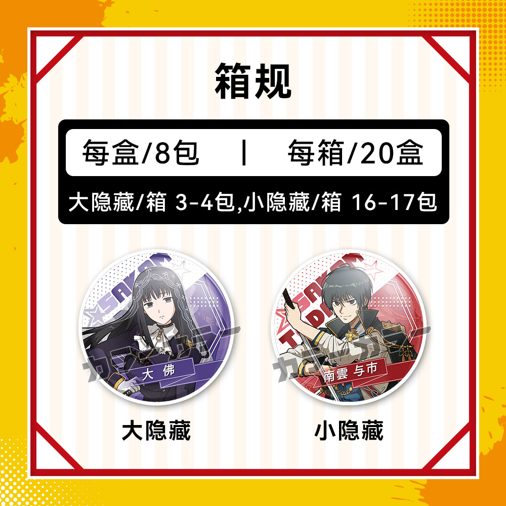 ![]() | (japanese fan erchuang) sakamoto daily badge (8 packs/box) | One unit contains 20 boxes, with each box containing 8 packs. there's a chance of pulling a rare, oversized secret chase figure (58mm) | 8шт: ¥8.00, 16шт: ¥7.50, 160шт: ¥7.30 | 3960 | 5960600988423 | |