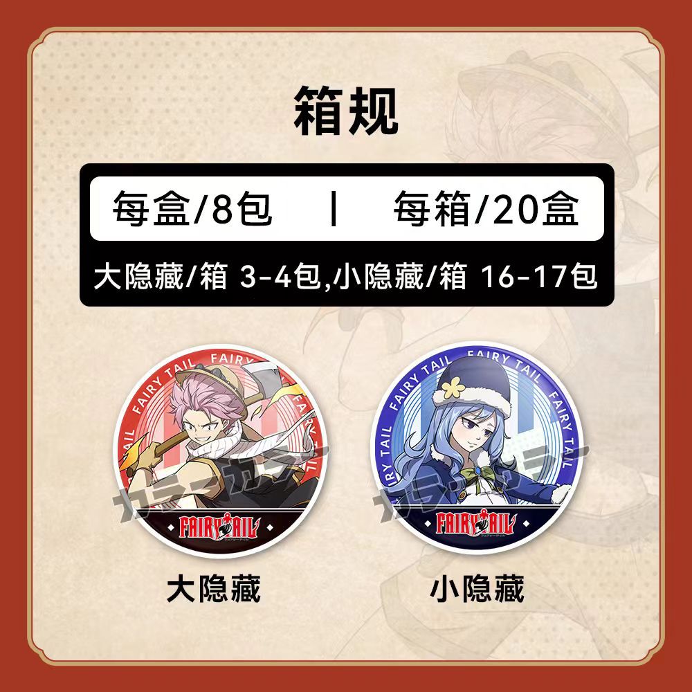 ![]() | (japanese fan's second branch) fairy tail badge (8 packs/box) | One unit contains 20 boxes, with each box containing 8 packs. there's a chance of pulling a rare, oversized secret chase figure (58mm) | 8шт: ¥8.00, 16шт: ¥7.50, 160шт: ¥7.30 | 3944 | 5960600988409 | |