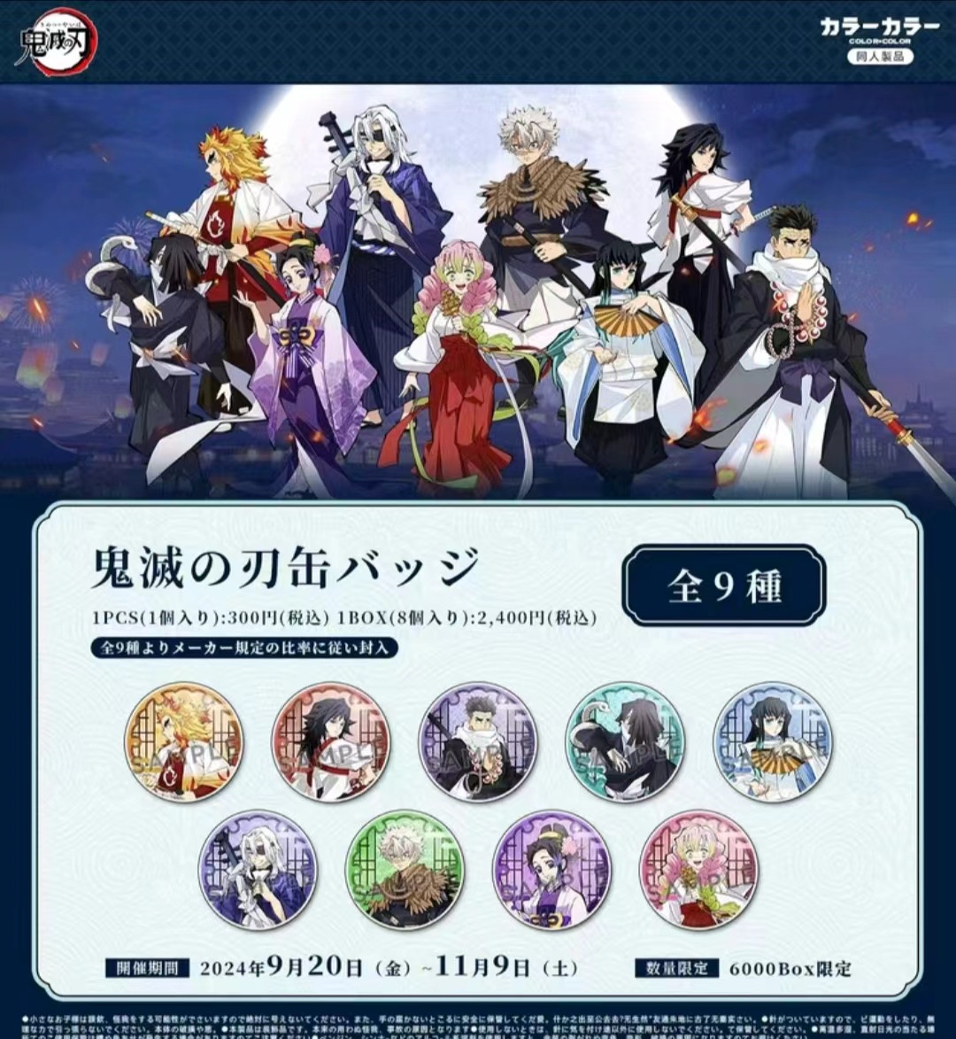 ![]() | (japanese fan erchuang) demon slayer badge part 3 (8 packs/box) | One unit contains 20 boxes, with each box containing 8 packs. there's a chance of pulling a rare, oversized secret chase figure (58mm) | 8шт: ¥8.00, 16шт: ¥7.50, 160шт: ¥7.30 | 3400 | 5960600988417 | |