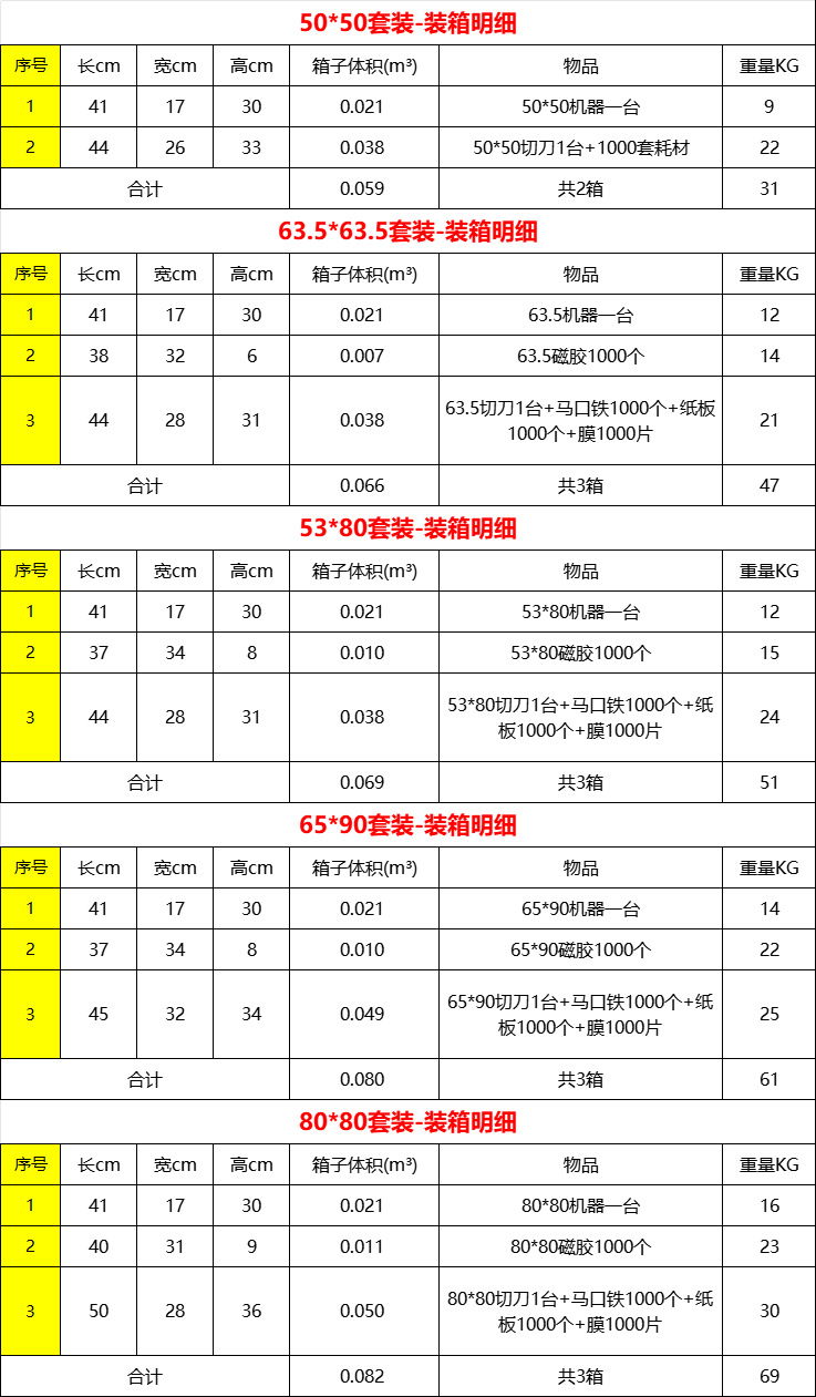 ![]() | 50*50 set: machine + cutter + 1000 sets of cardboard + magnetic glue consumables (31kg) | ¥4250.0 / ≈ 51 194 ₽ | 9969 | 5855900403035 | |