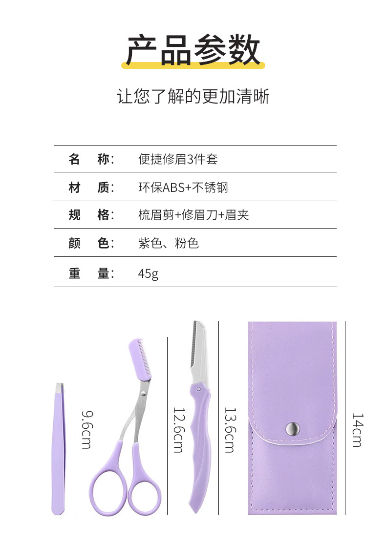 ![]() | Purple eyebrow razor + eyebrow clip + eyebrow scissors + leather case | ¥3.6 / ≈ 43 ₽ | 2132 | 5854216894030 |
