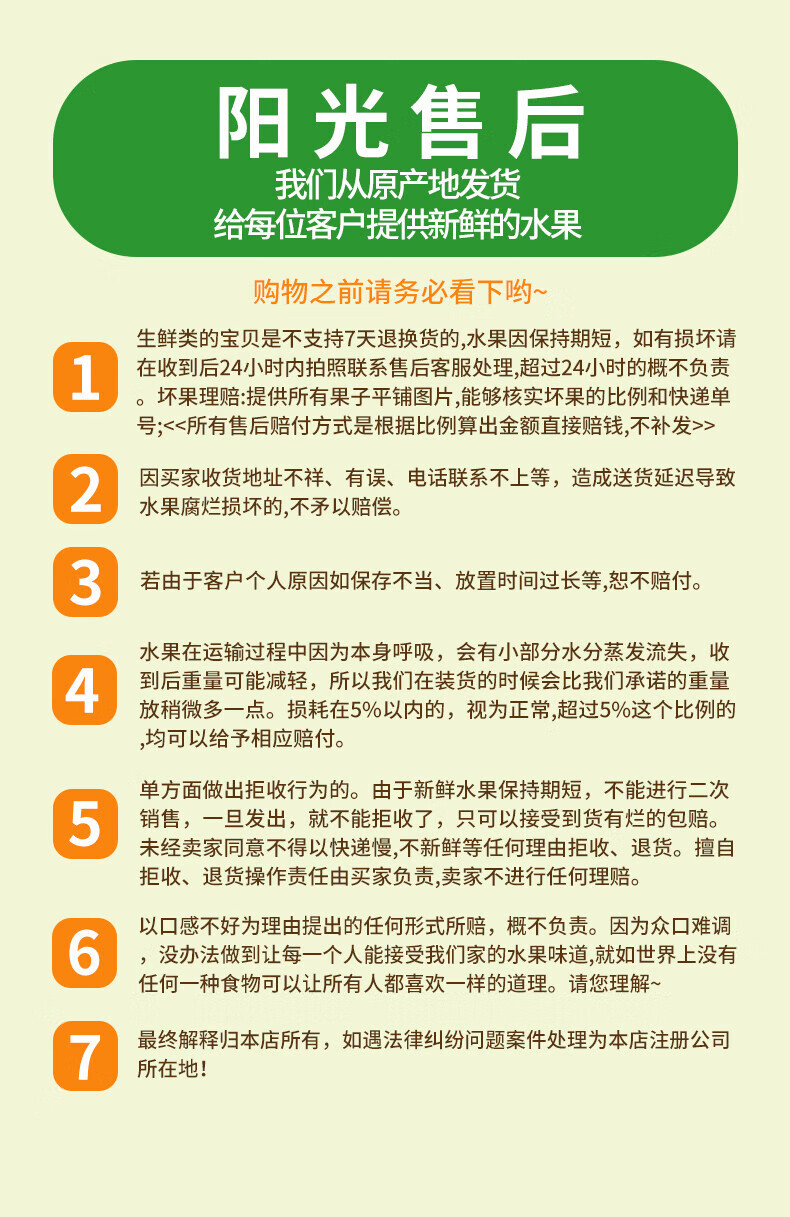 5.生鲜水果因轻微磕碰或者口感/品相问题不影响食用的不予赔付。