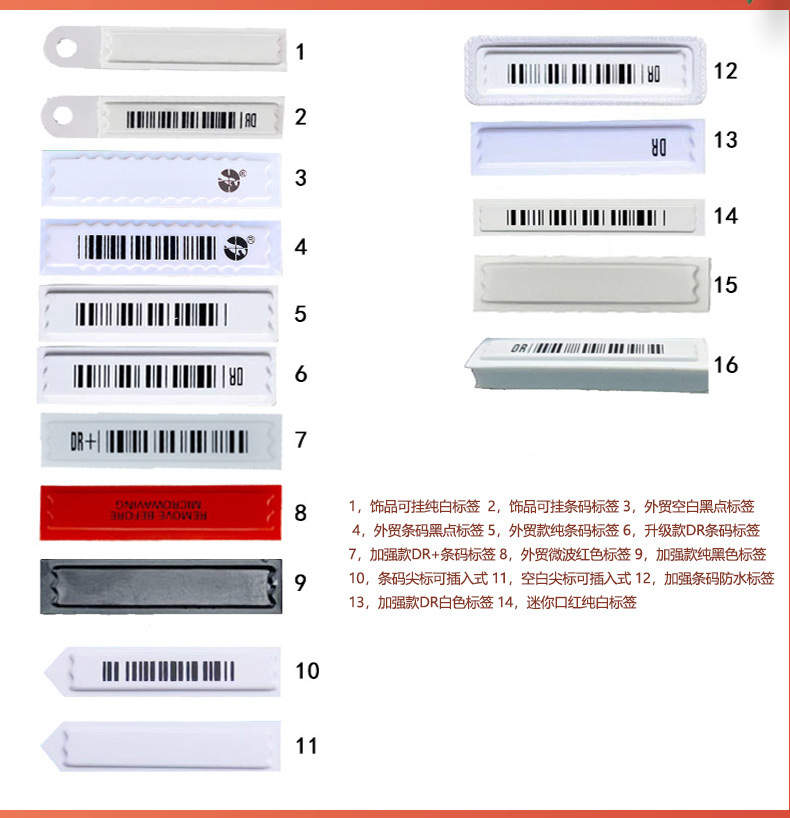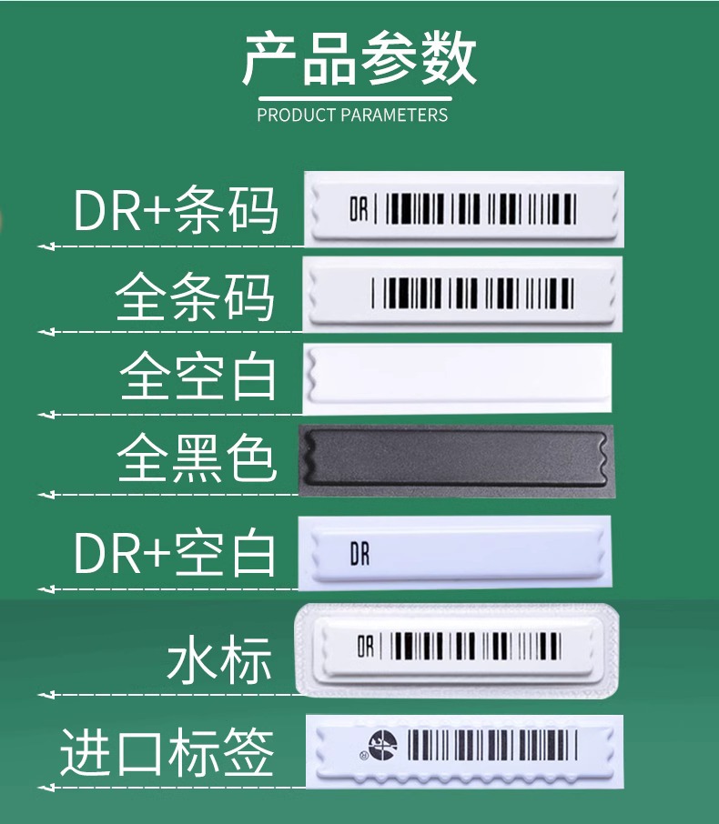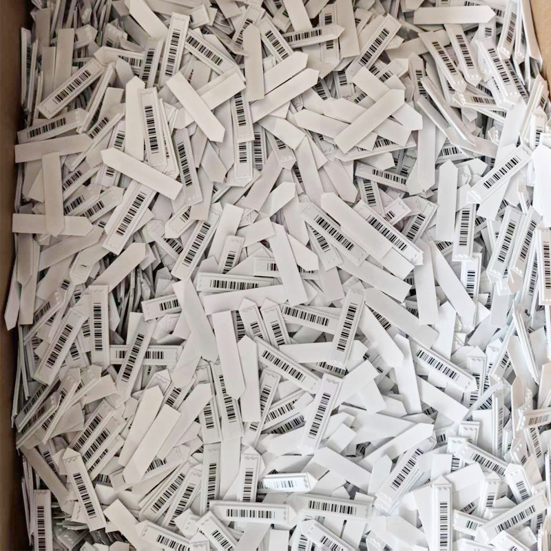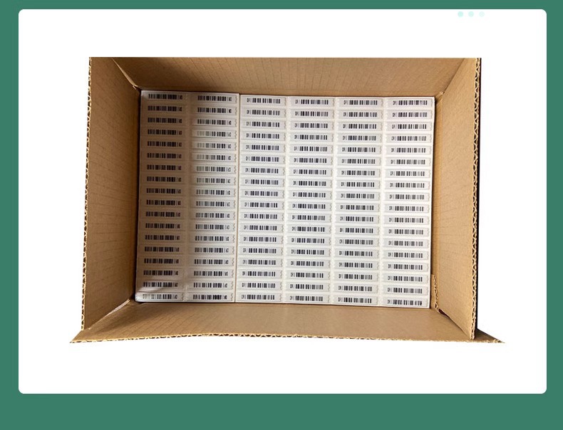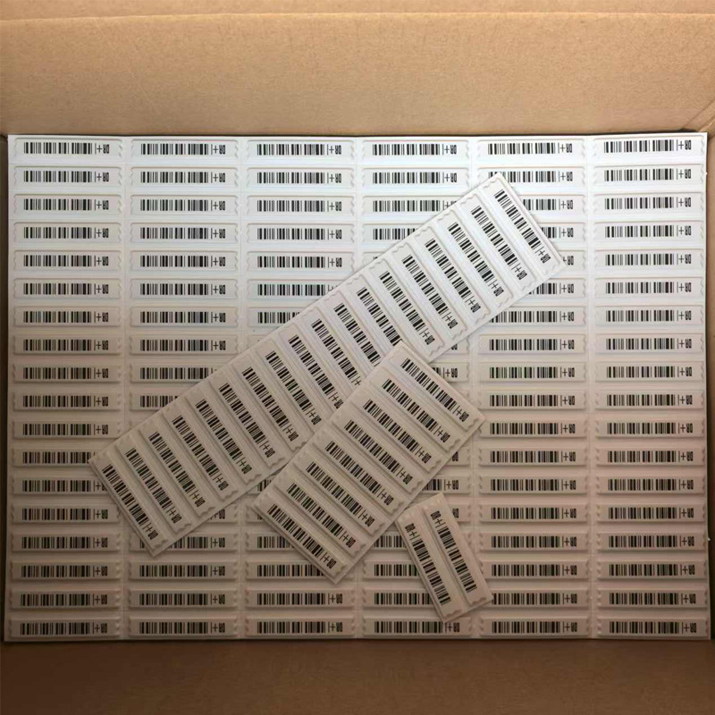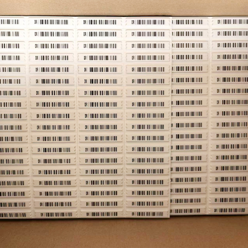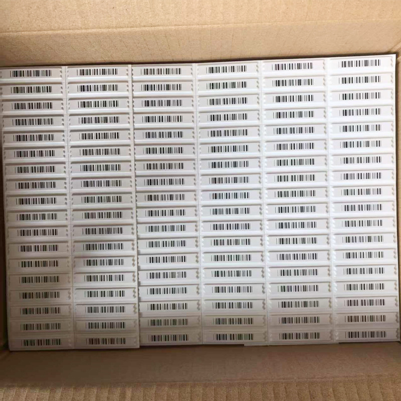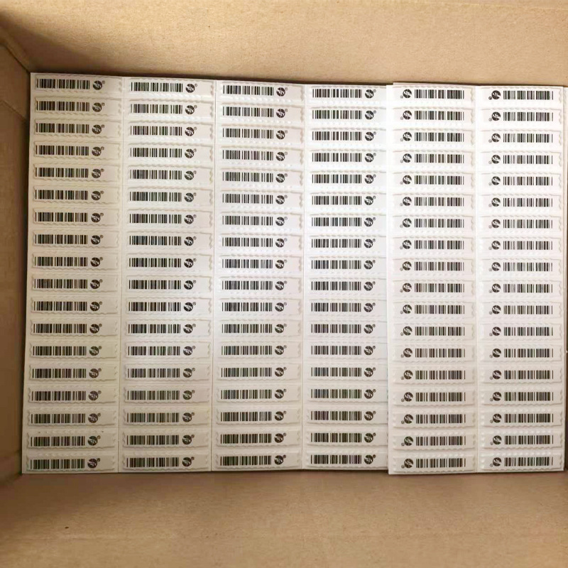 Material: Polystyrene (box), iron, cobalt, silicone glue Binding: 2.47Kg/box Color specifications: White/bar code, 5000 pieces/box Size: 46 ×11 (thickness 1.89 mm) Distance: 1.1 or 1.5 meters Shielding: Not suitable for metal containers