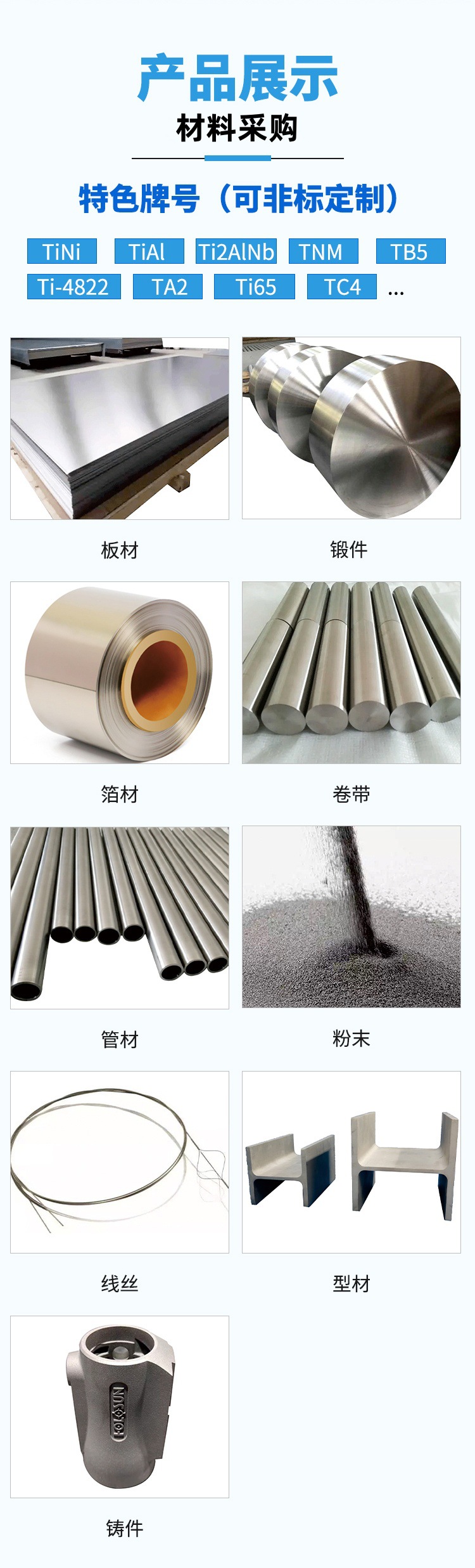 公司目前主要产品有各类钛合金板箔棒材及粉末等,涵盖TiNi、TiAl、Ti2AlNb、TNM、TB5、Ti-4822、TA2、Ti65、TC4等各类牌号,同时还提供各类加工测试服务,欢迎咨询合作!