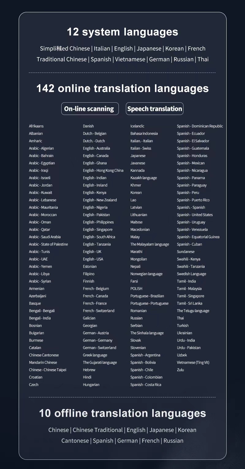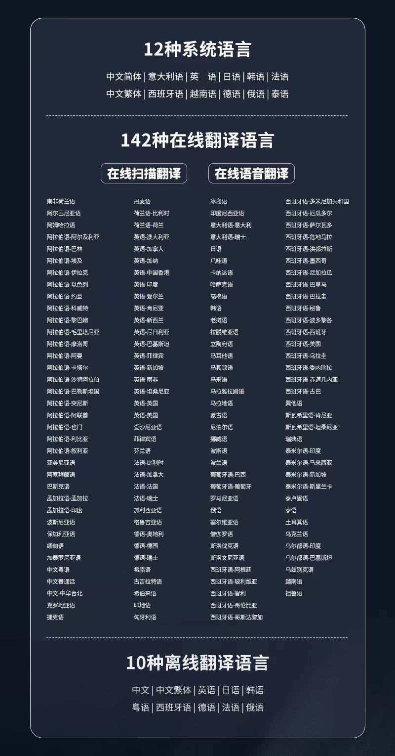●支持142国在线扫描翻译;中简、中繁、粤、英、德、日、韩、俄.阿拉伯语,西班牙语,法语,意大利语,葡萄牙语,印尼语,马来西亚语,越南语,荷兰语,波兰语,瑞典语,南非,加泰罗尼亚,捷克,菲律宾语.克罗地亚,冰岛,匈牙利语,挪威博克马尔,罗马尼亚语,土耳其语,希腊语,保加利亚语,塞尔维亚语,乌克兰,泰语等
