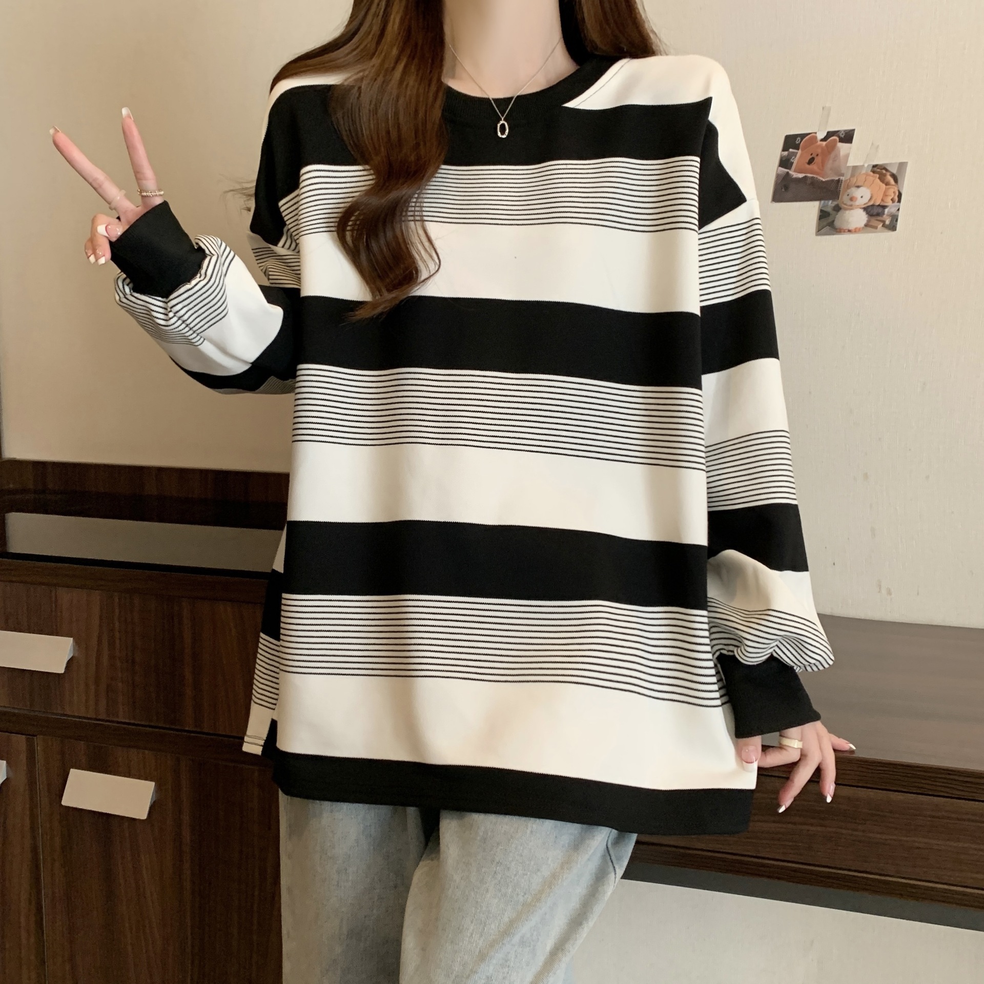 Футболка 2025 года новая весна и осень для женщин, свободная облегающая толстушка, большой размер, полосатый длинный рукав, тонкий ретро свитшот