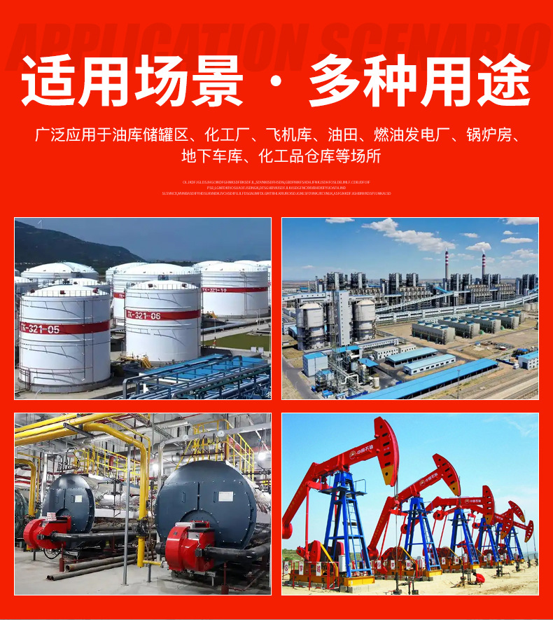 Область применения Mainly suitable for oil fields, oil tank areas and oil refining plants, petroleum, chemical enterprises, oil transportation ports, aircraft libraries, and automobile