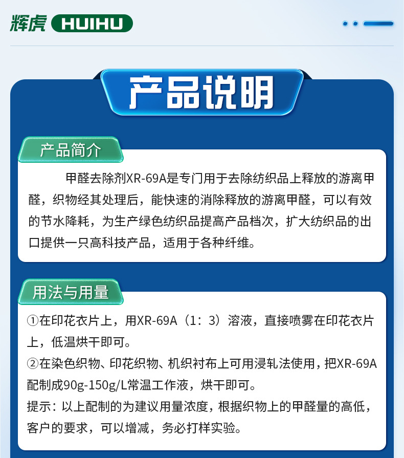 甲醛去除剂XR-69A是专门用于去除纺织品上释放的游离甲醛,织物经其处理后,能快速的消除释放的游离甲醛,可以有效的节水降耗,为生产绿色纺织品提高产品档次,扩大纺织品的出口提供一只高科技产品,适用于各种纤维。