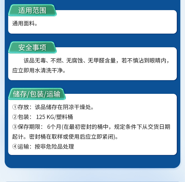 2、 在染色织物、印花织物、机织衬布上可用浸轧法使用,把XR-69A配制成90g-150g/L常温工作液,烘干即可。