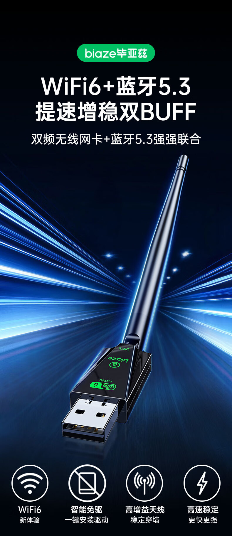 Biaz Bluetooth адаптер 5.3 AX900 WiFi6 драйвер-free USB беспроводная сетевая карта двойной диапазон 5G 2-в-1