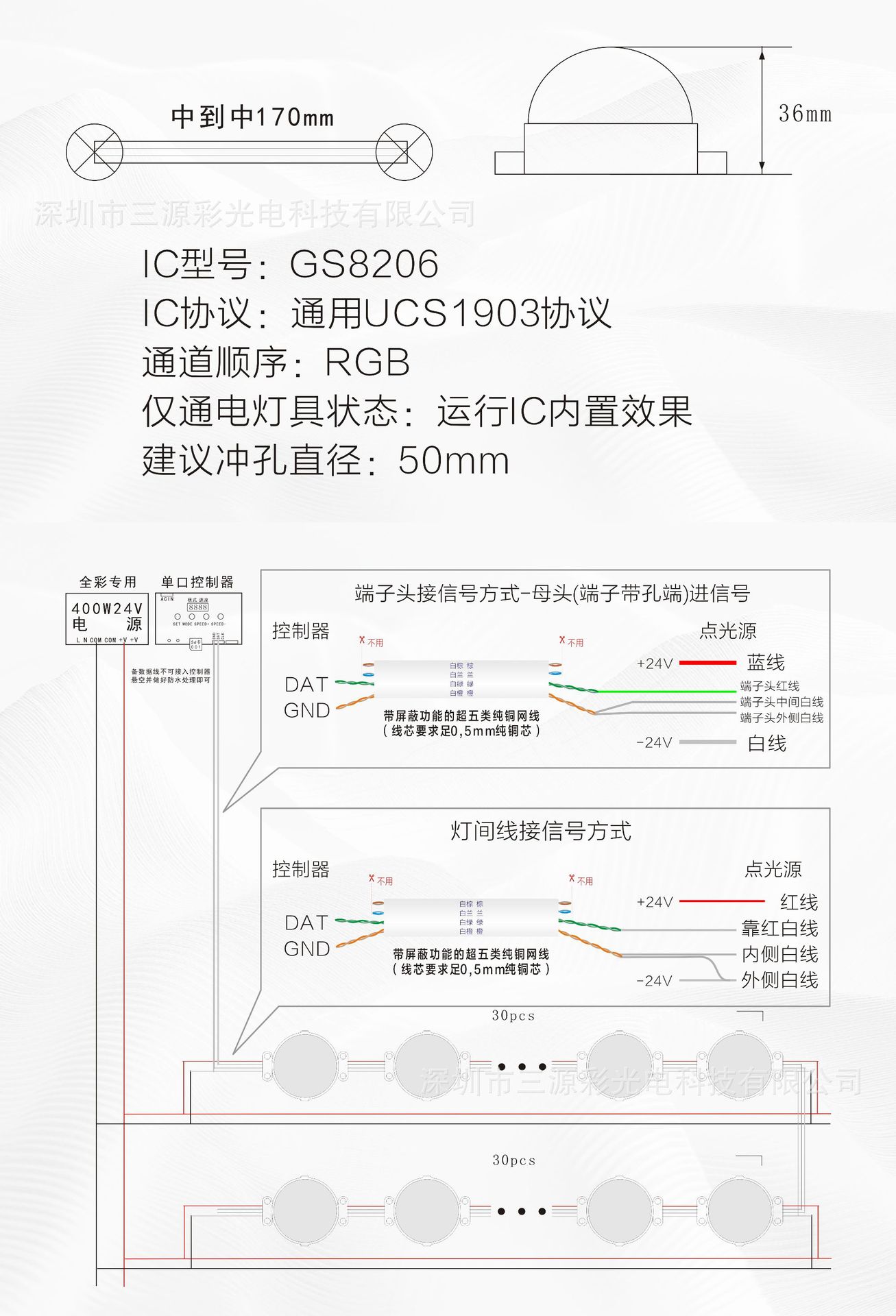 Оригинальный 50мм 24V Полноцветный источник точечного света Пиксельный точечный внутренний контроль Маркировка Gs8206 Обновление светодиодной гирлянды