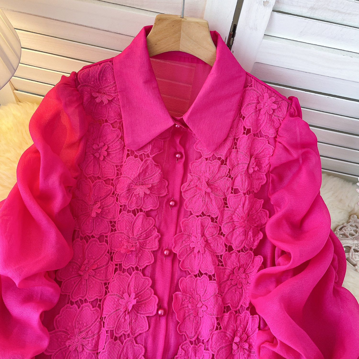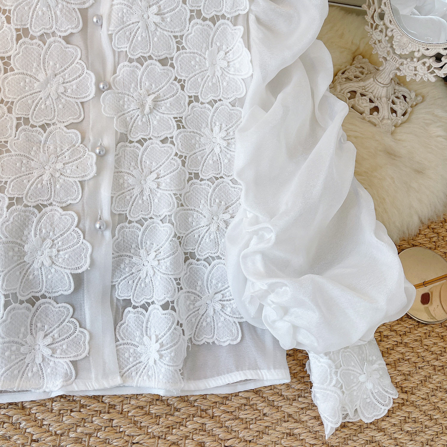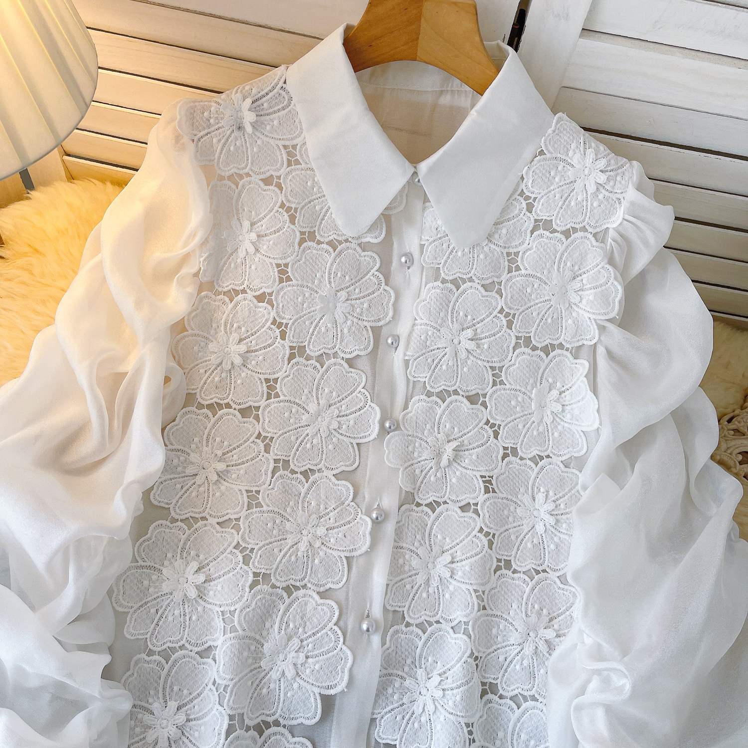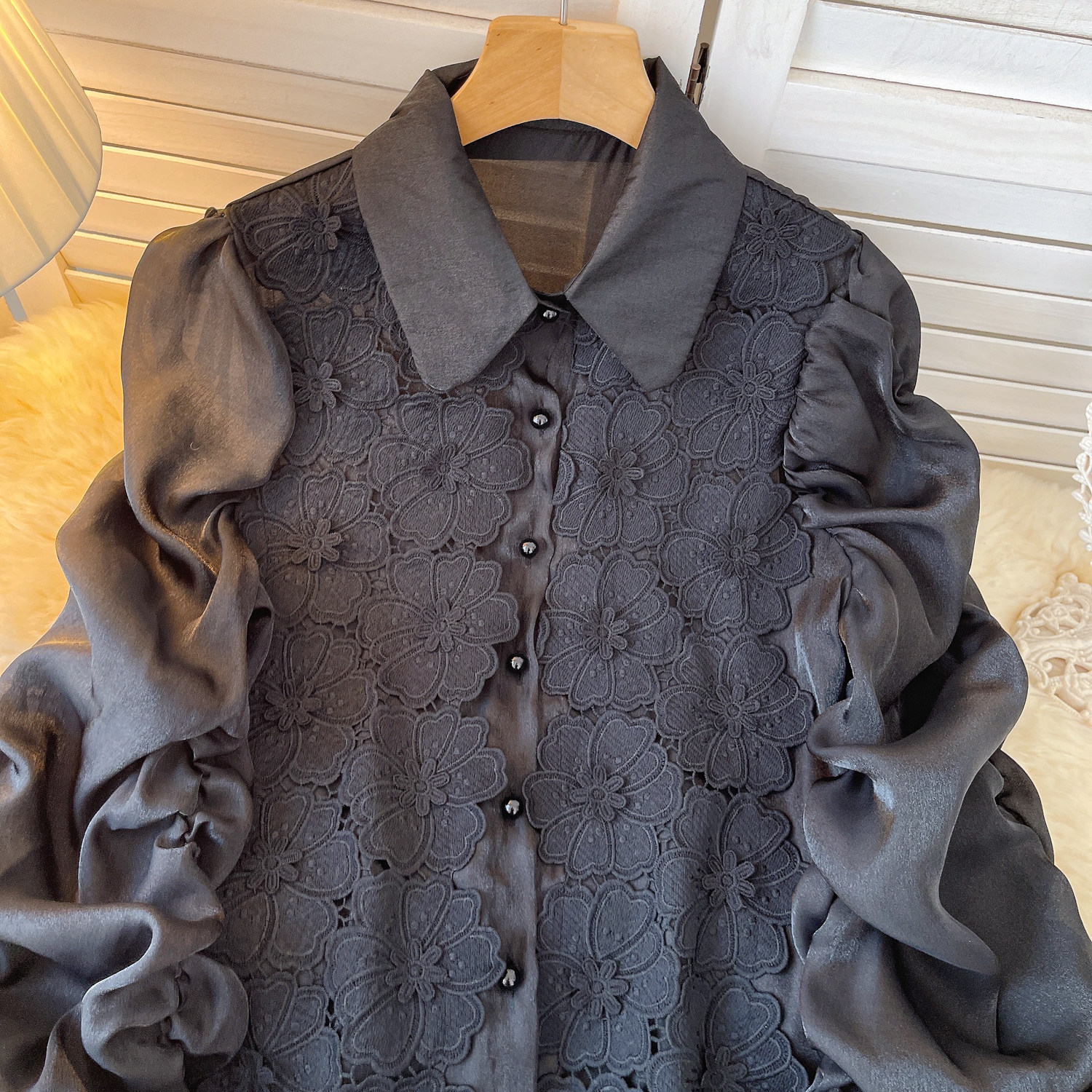 Интернет-знаменитость Тот же стиль 2024 Осень Нишевый вход Роскошная тяжелая промышленность Пустотелая цветочная вышивка Плиссированная фонарная рукава Облегающая рубашка для женщин