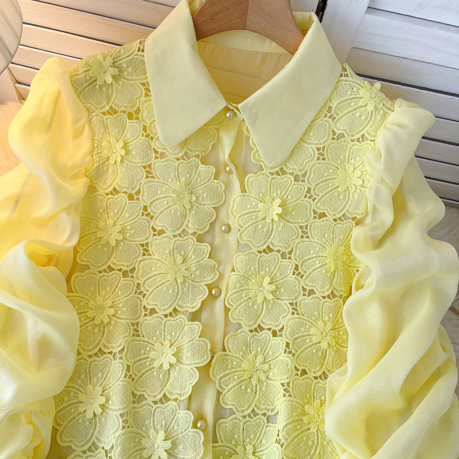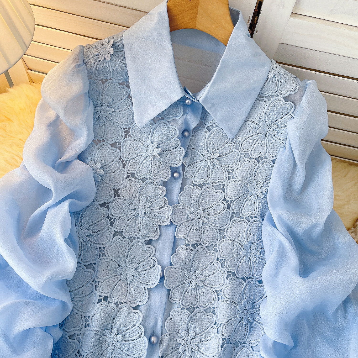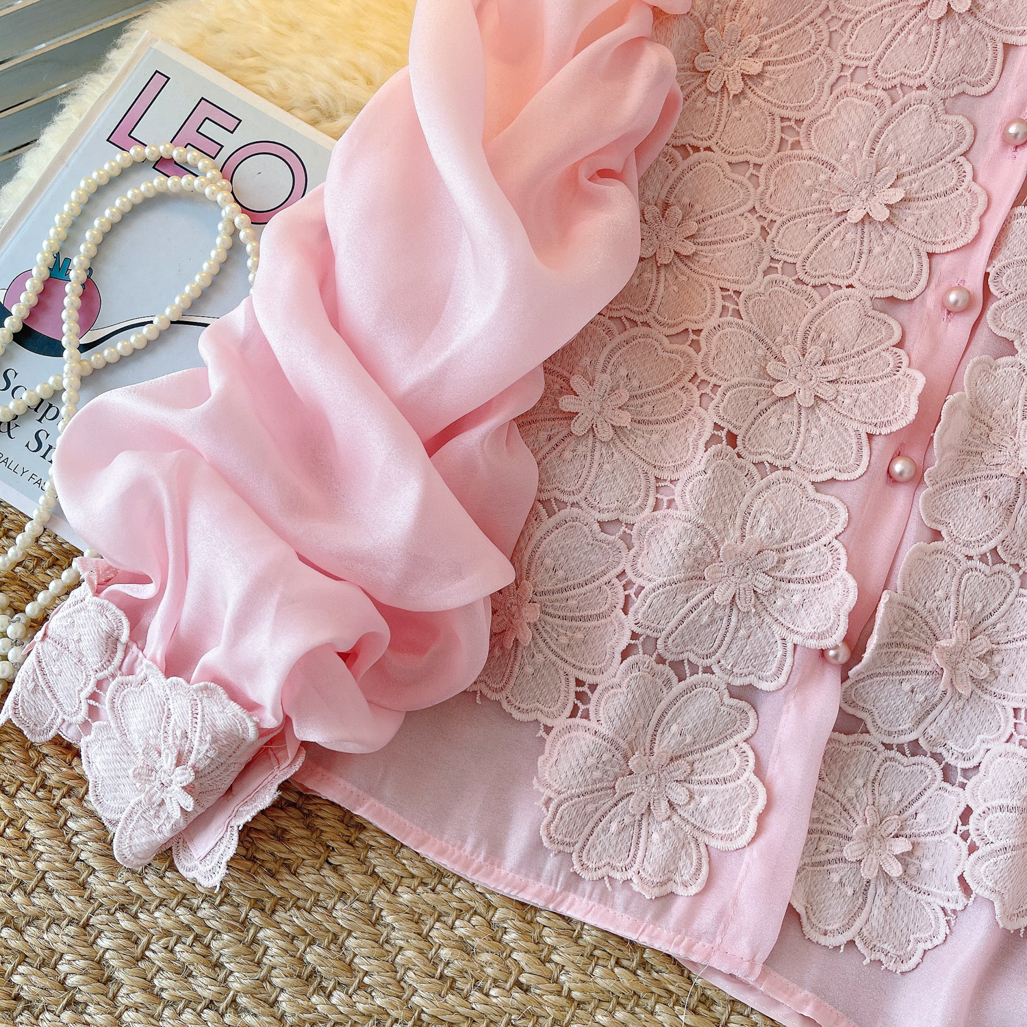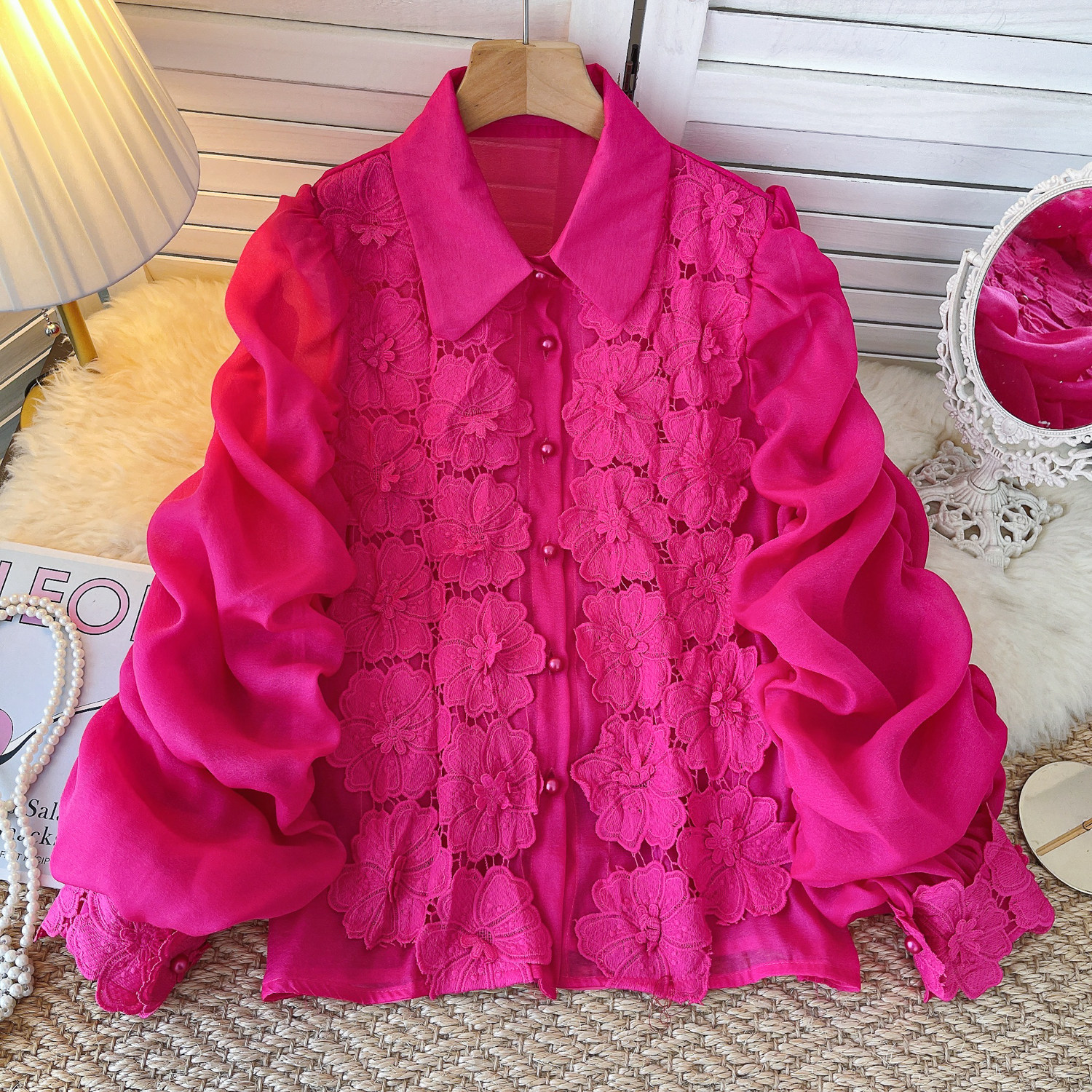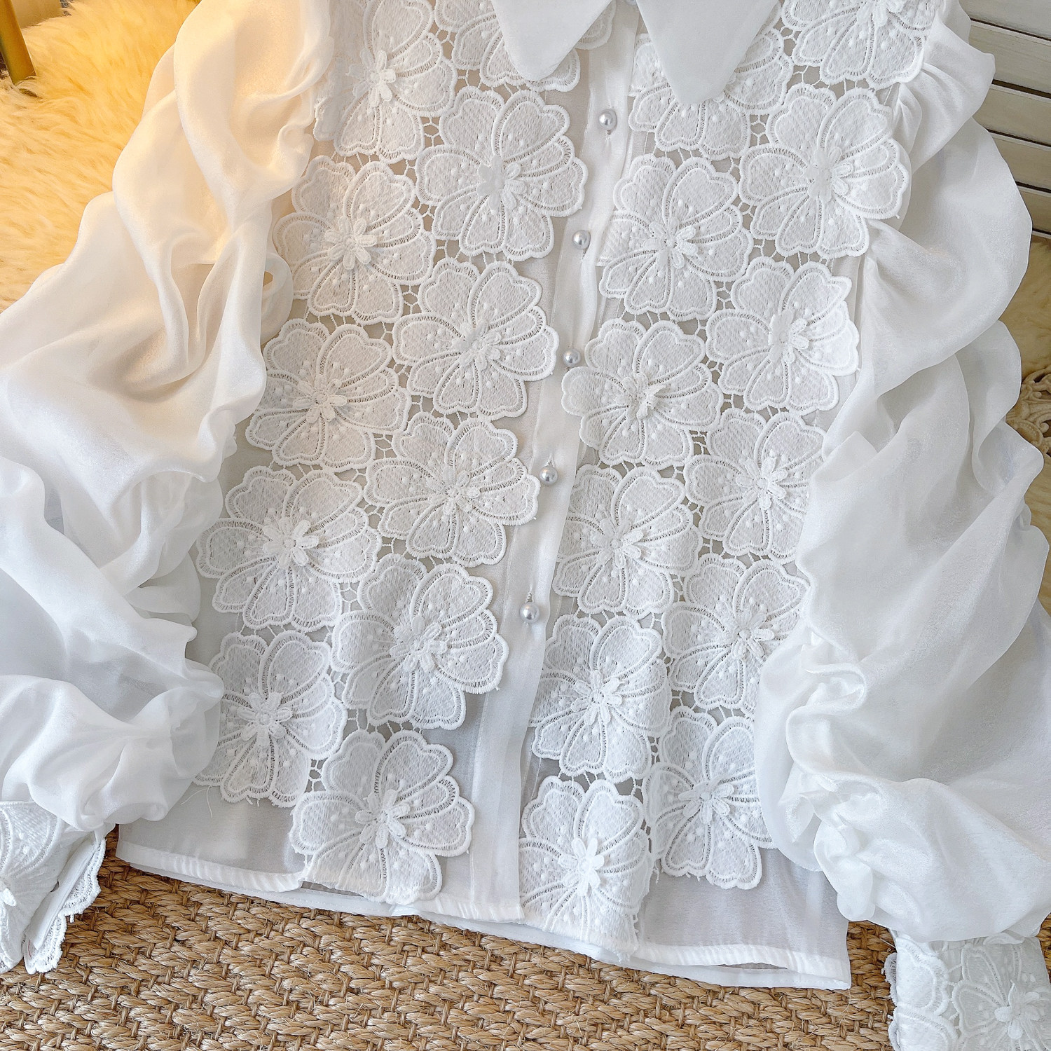 Интернет-знаменитость Тот же стиль 2024 Осень Нишевый вход Роскошная тяжелая промышленность Пустотелая цветочная вышивка Плиссированная фонарная рукава Облегающая рубашка для женщин