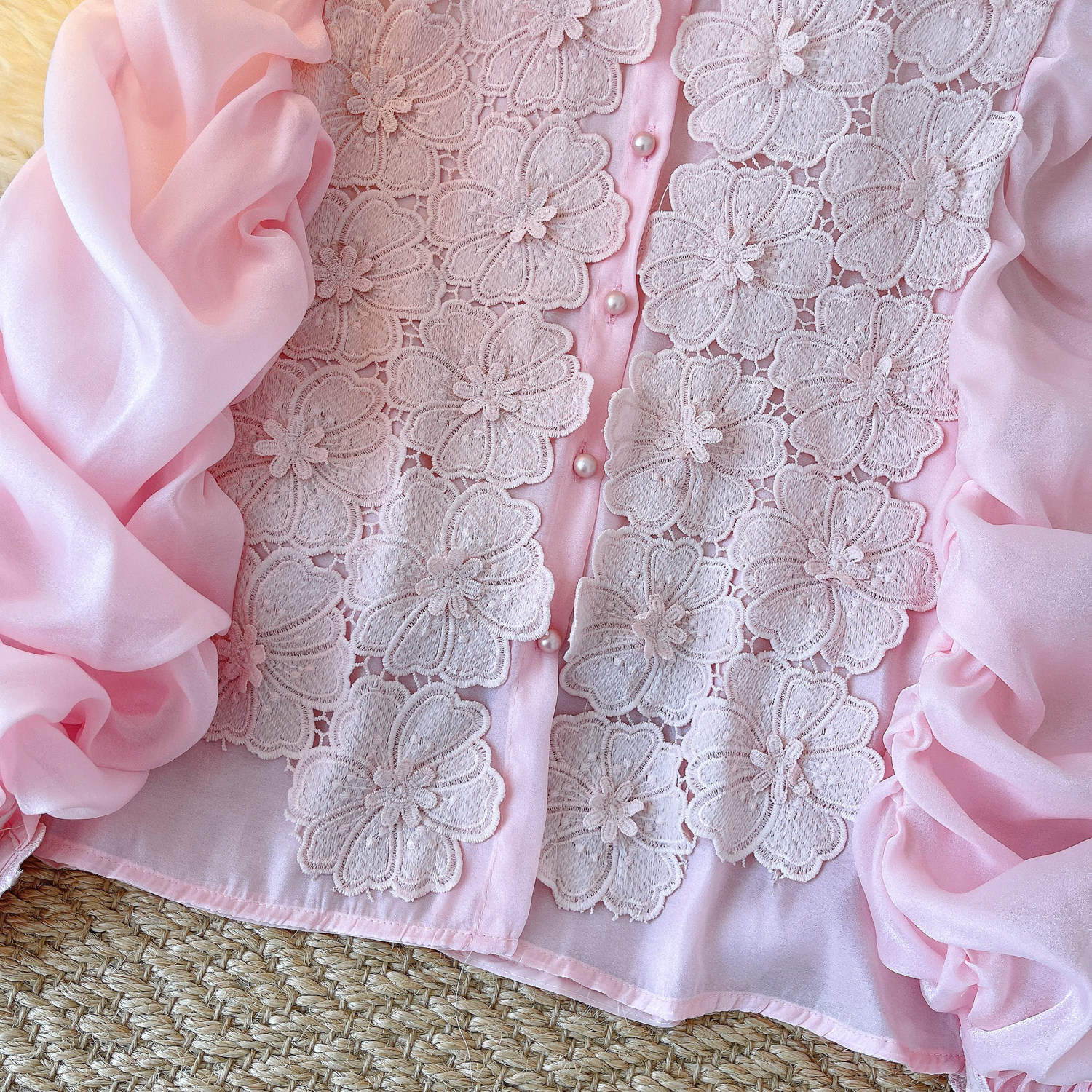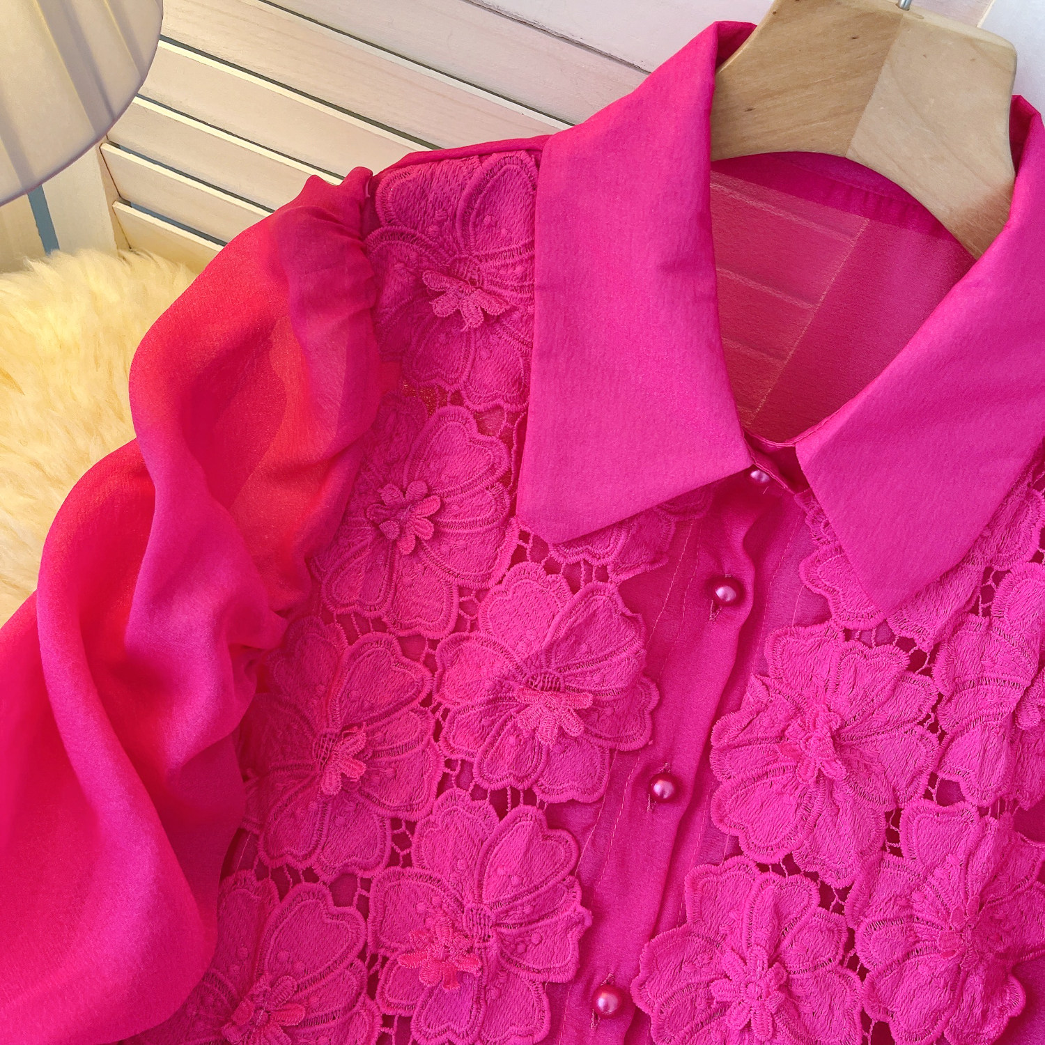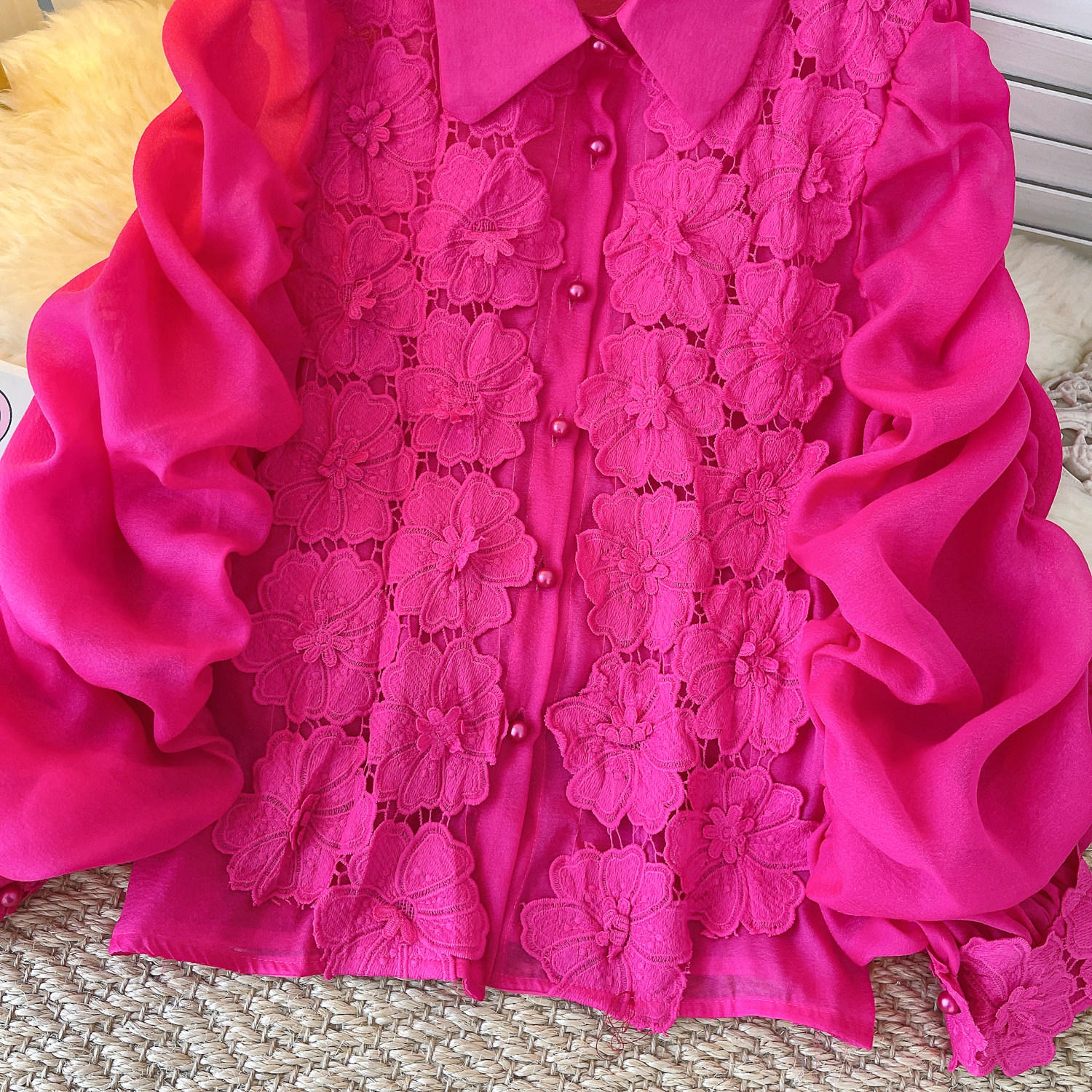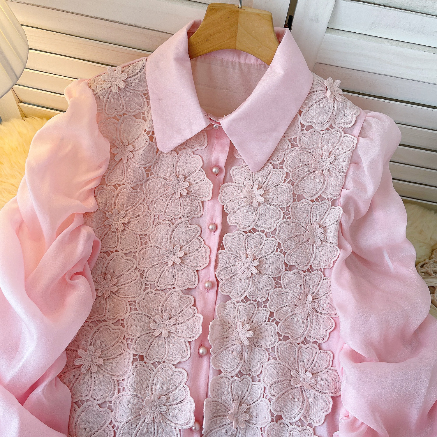 Интернет-знаменитость Тот же стиль 2024 Осень Нишевый вход Роскошная тяжелая промышленность Пустотелая цветочная вышивка Плиссированная фонарная рукава Облегающая рубашка для женщин