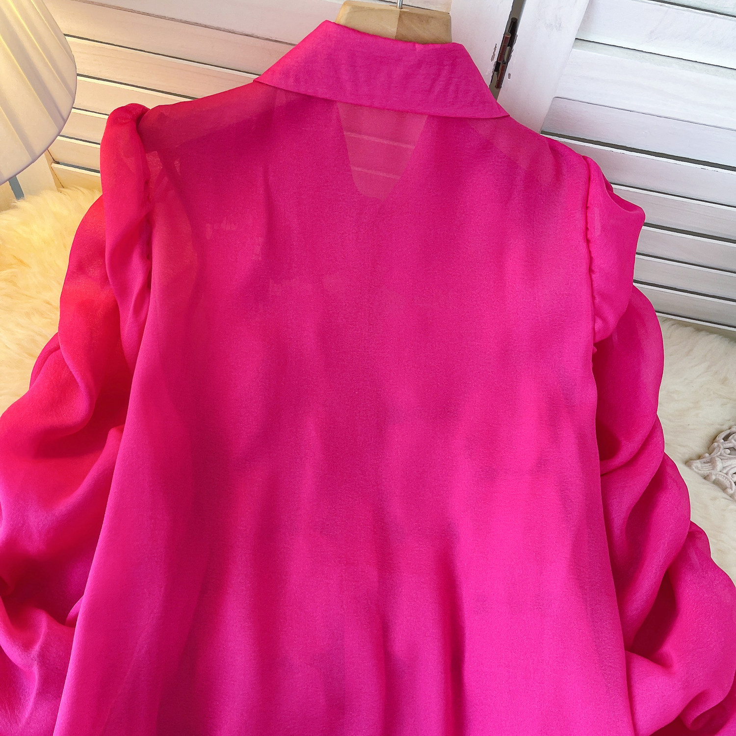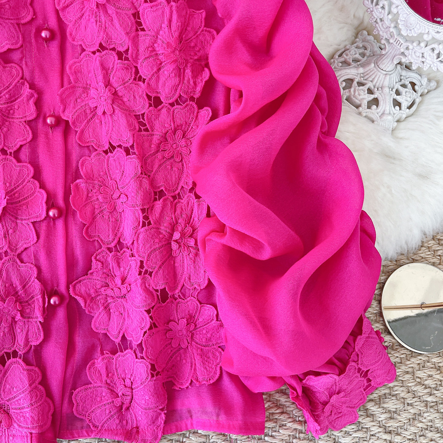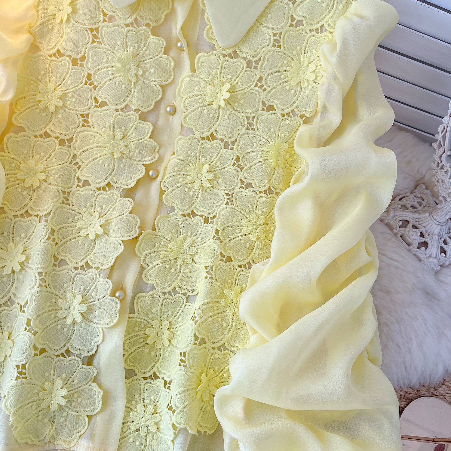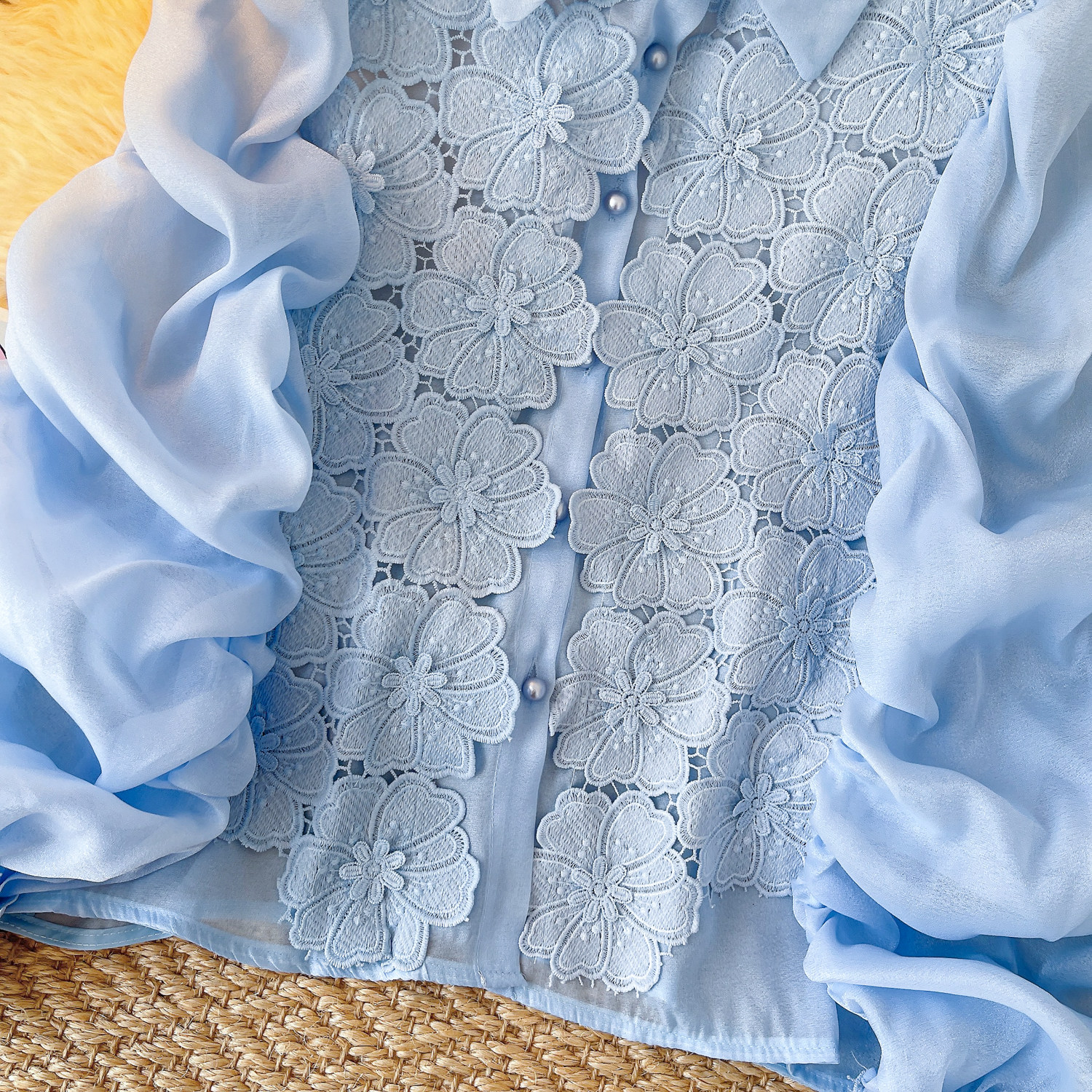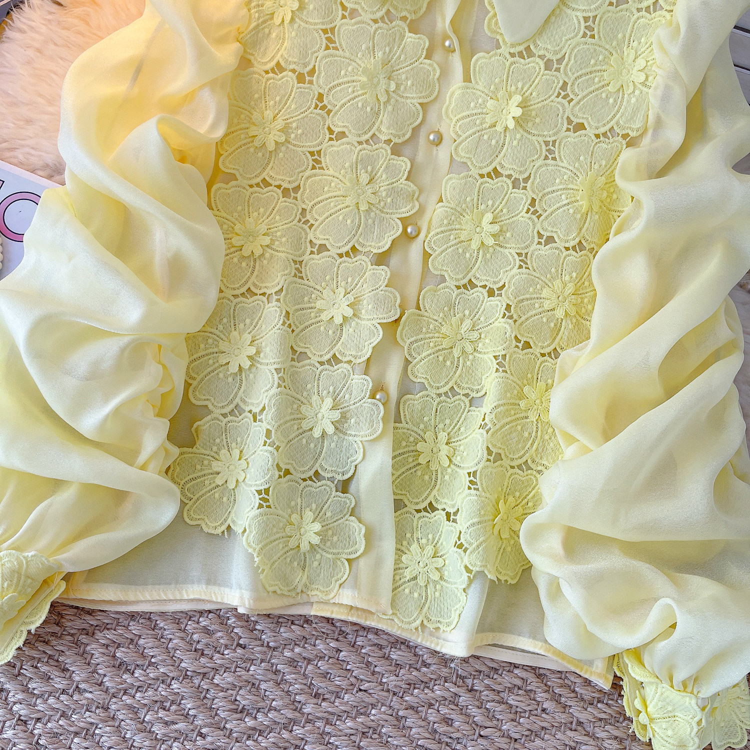 Интернет-знаменитость Тот же стиль 2024 Осень Нишевый вход Роскошная тяжелая промышленность Пустотелая цветочная вышивка Плиссированная фонарная рукава Облегающая рубашка для женщин