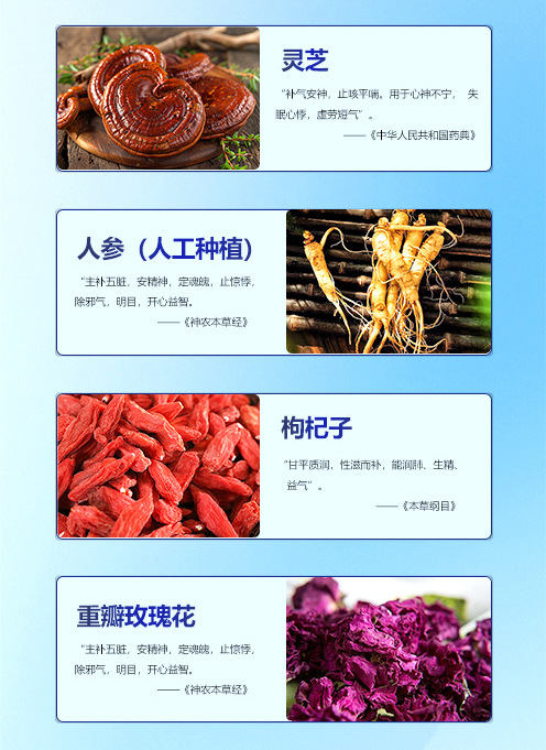 Основные сырьевые материалы Ginseng (artificially cultivated), wolfberry, ganoderma lucidum,