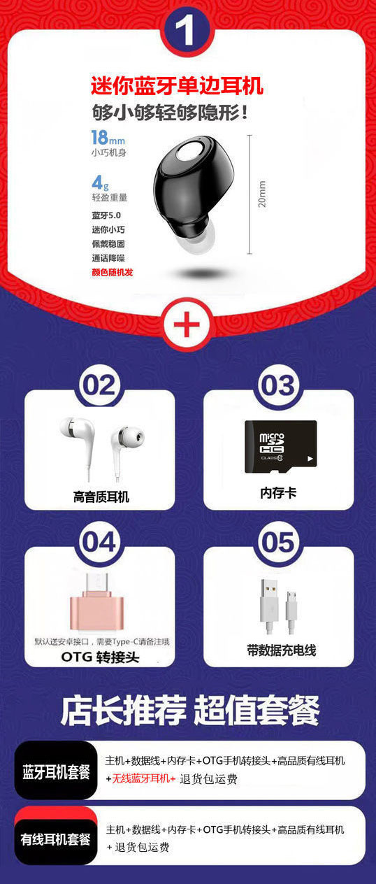 ![]() | Blue [with bluetooth] | 128g (host + earphones + memory card + otg + charging cable) | ¥49.0 / ≈ 597 ₽ | 4995 | 5748435053309 | |